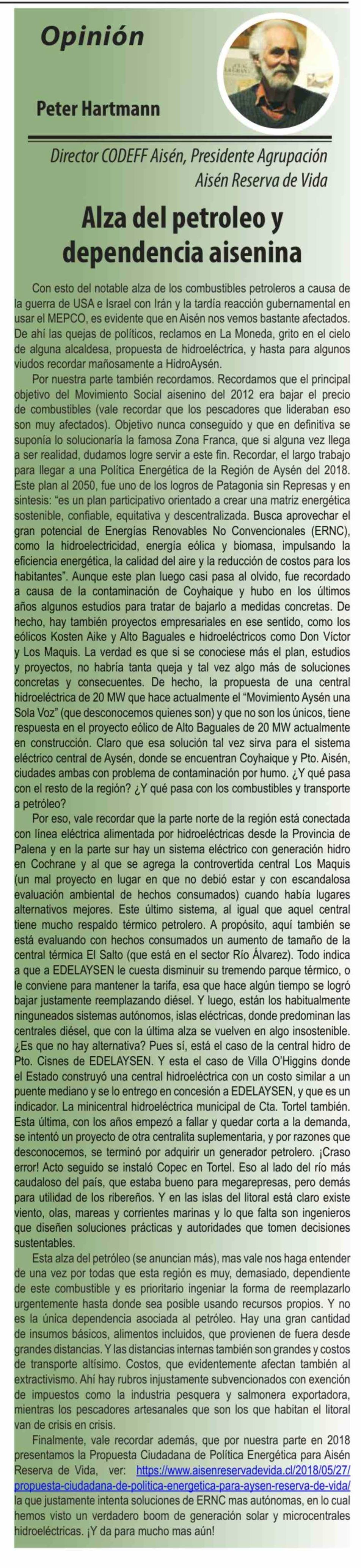 Columnas de Opinión: Alza del petroleo y dependencia aisenina