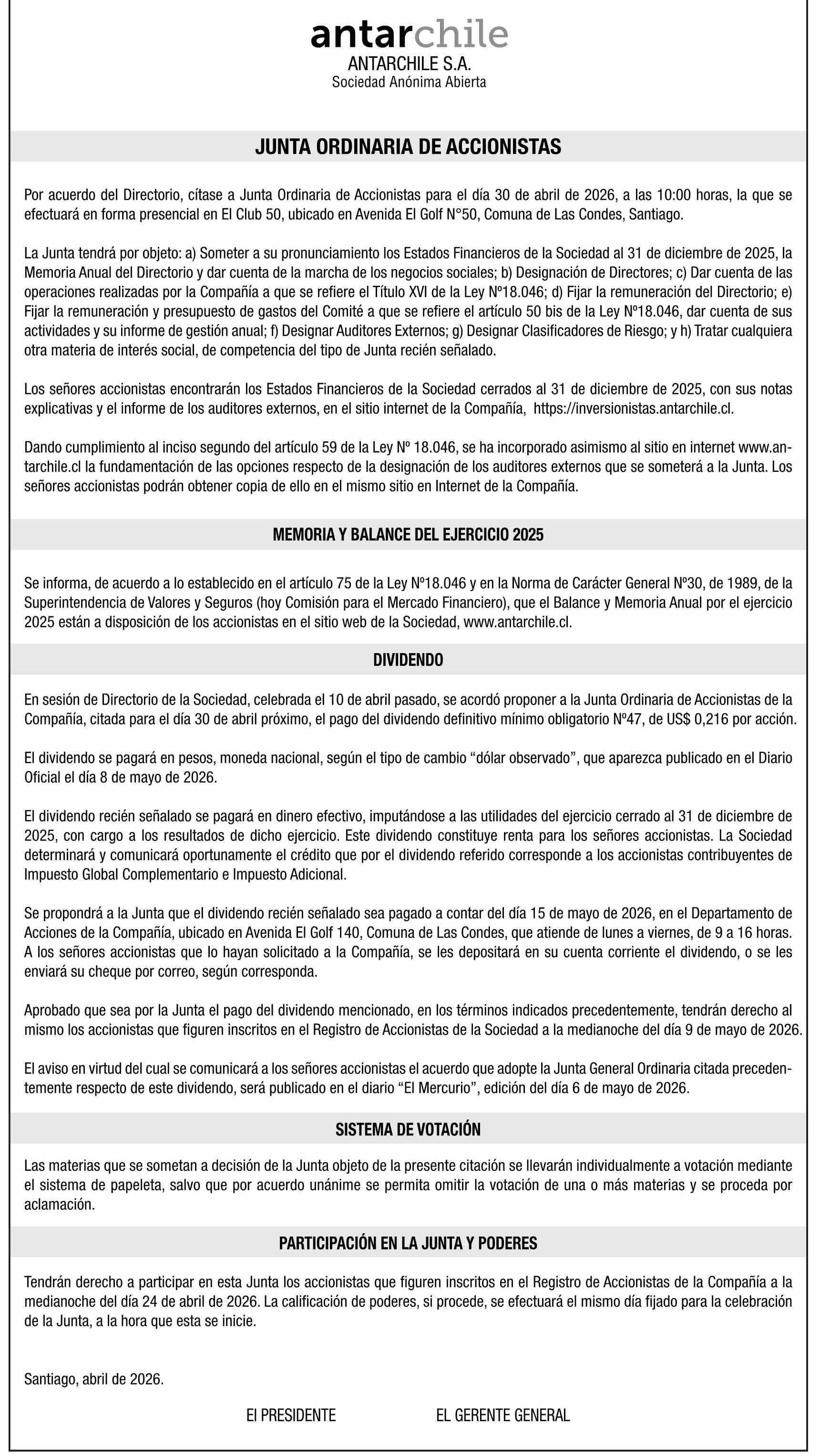 Extractos: ANTARCHILE S.A.