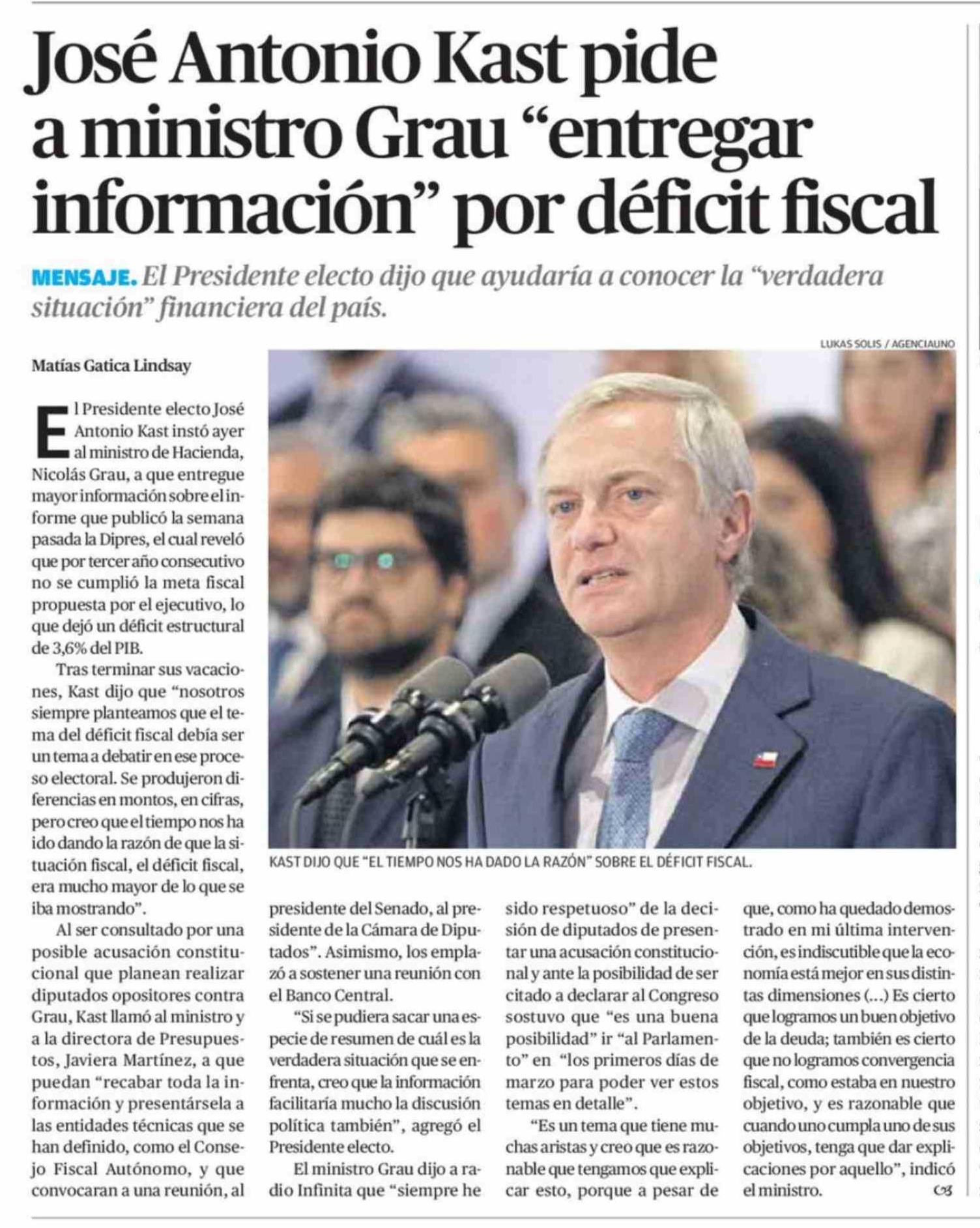José Antonio Kast pide a ministro Grau "entregar información" por déficit fiscal