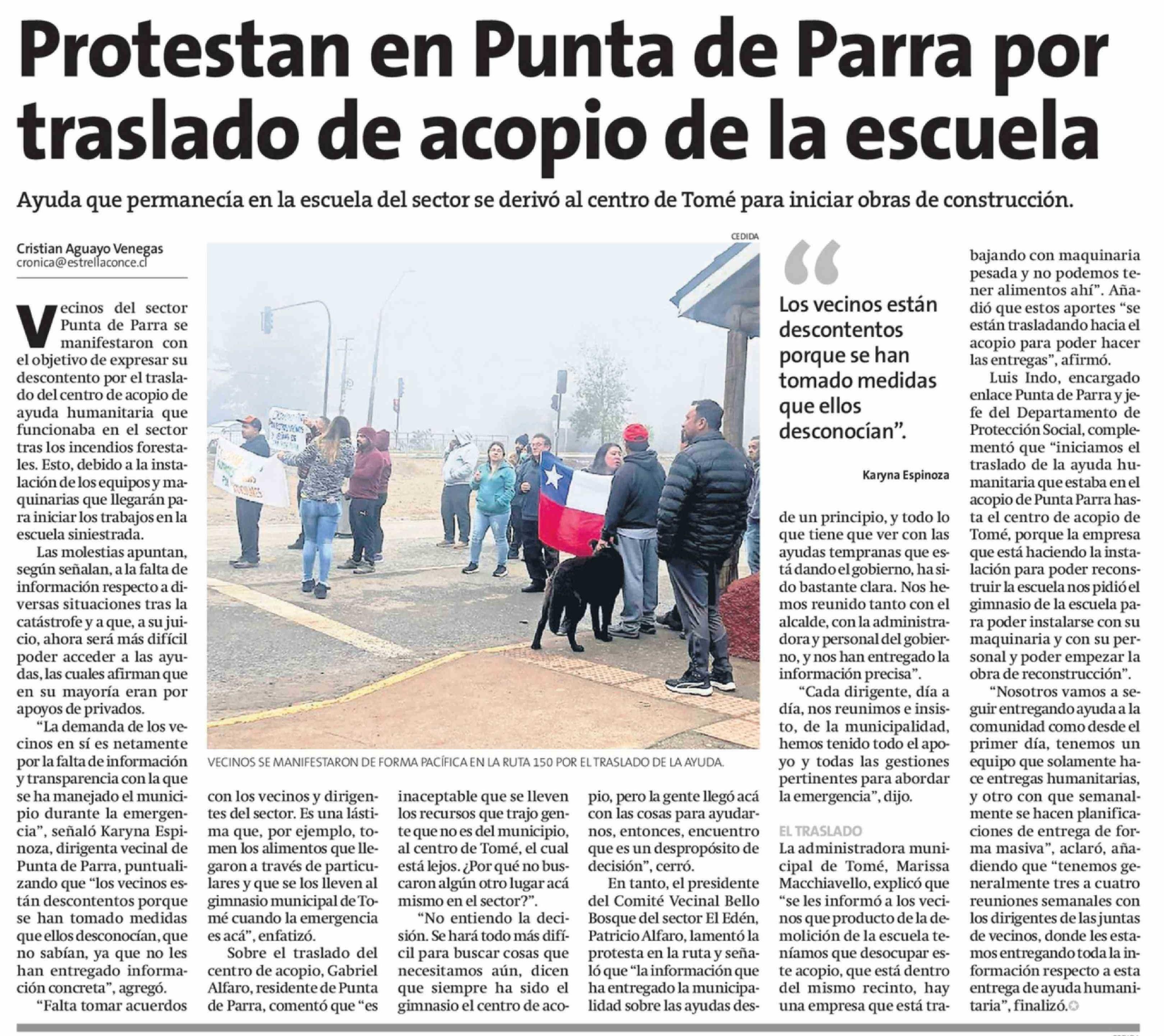 Protestan en Punta de Parra por traslado de acopio de la escuela