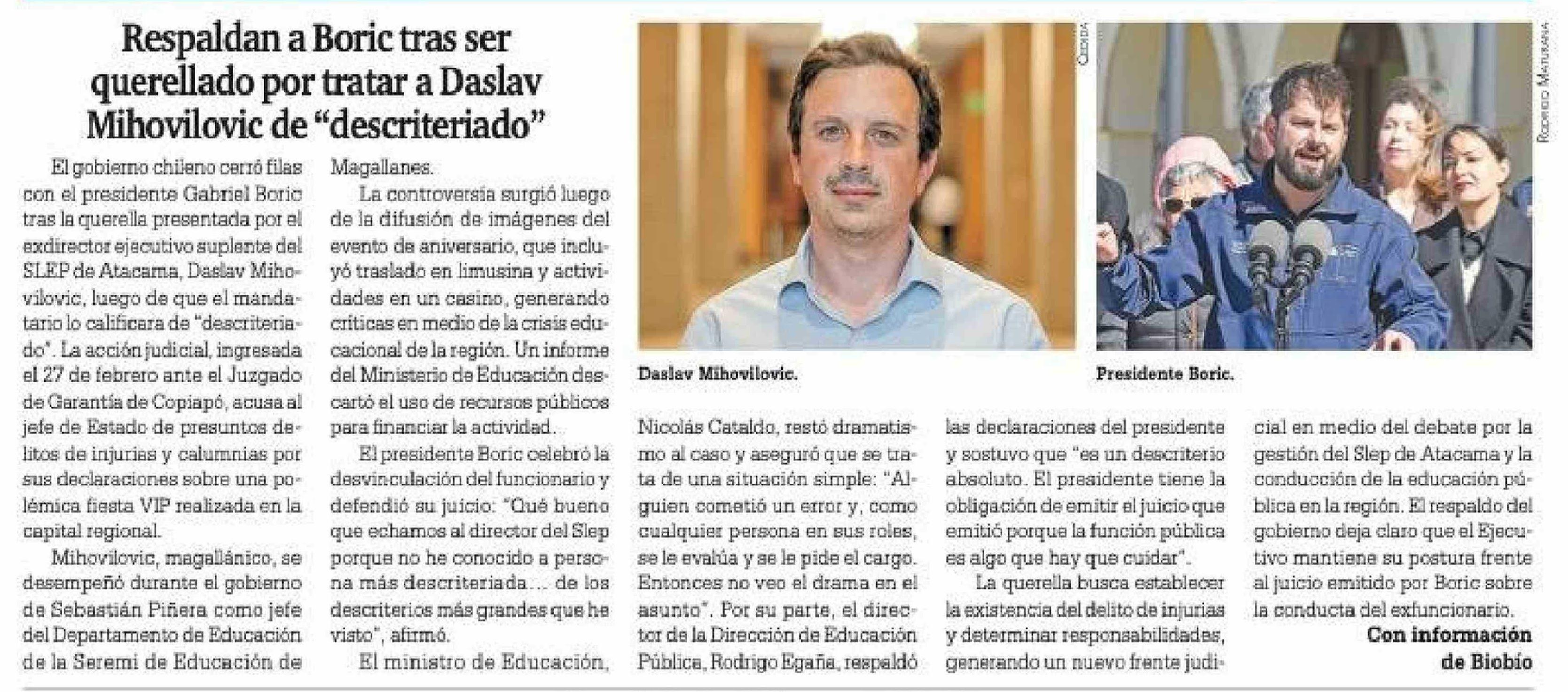 Respaldan a Boric tras ser querellado por tratar a Daslav Mihovilovic de "descriteriado"