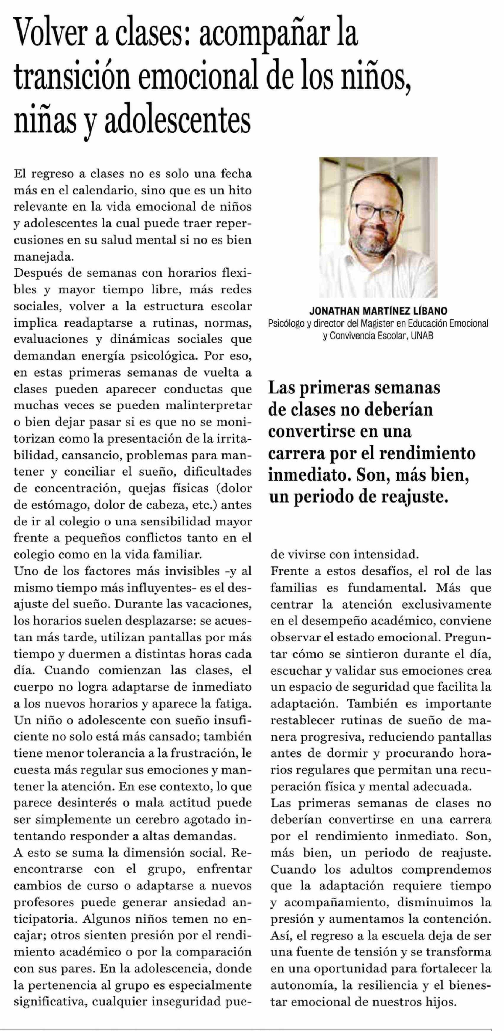 Columnas de Opinión: Volver a clases: acompañar la transición emocional de los niños, niñas y adolescentes