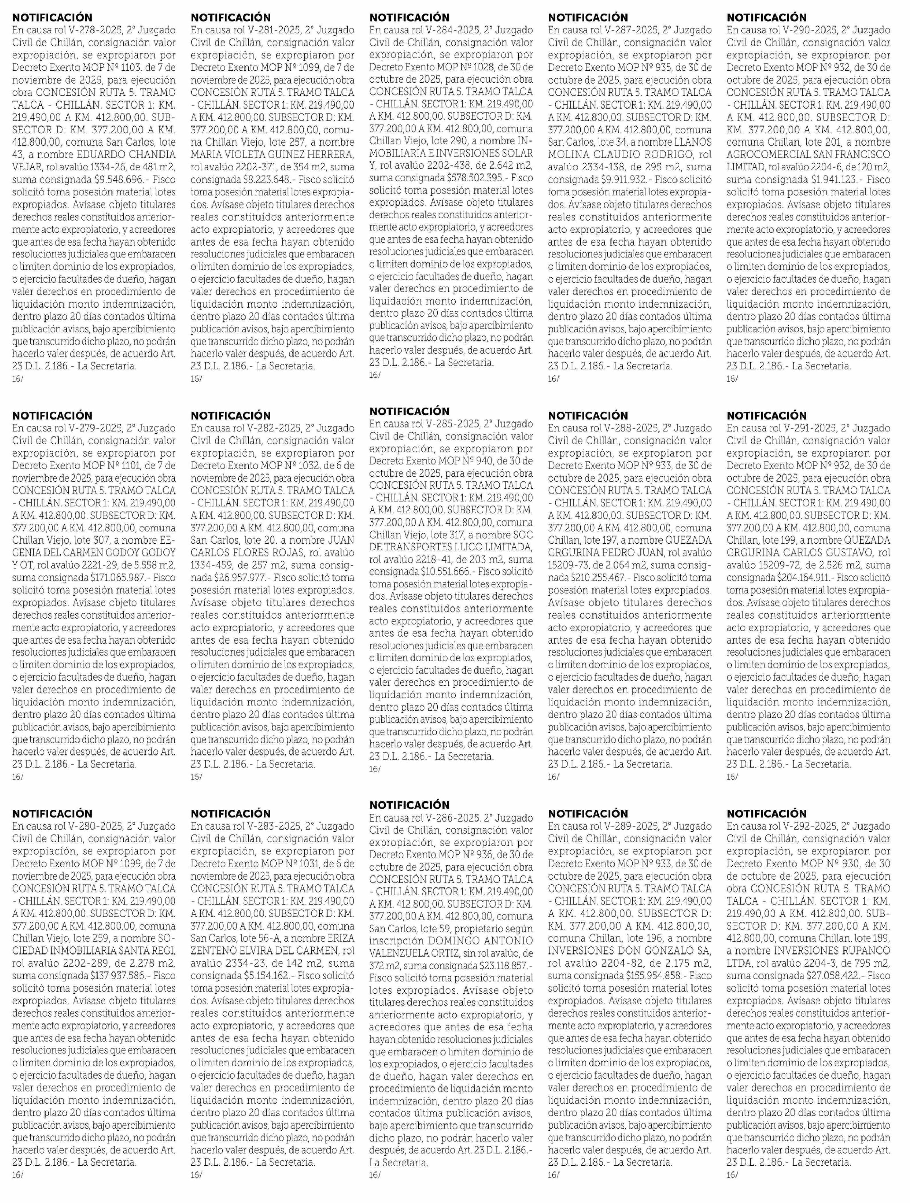 Título: NOTIFICACIÓN En causa rol V-279-2025, 2° Juzgado Civil de Chillán, consignación valor expropiación, se expropiaron por Decreto Exento MOP Nº 1101, de 7 de noviembre de 2025, para ejecución obra CONCESIÓN RUTA 5. TRAMO TALCA - CHILLÁN. SECTOR 1: KM. 219.490,00 AKM. 412.800,00. SUBSECTOR D: KM. 377.20