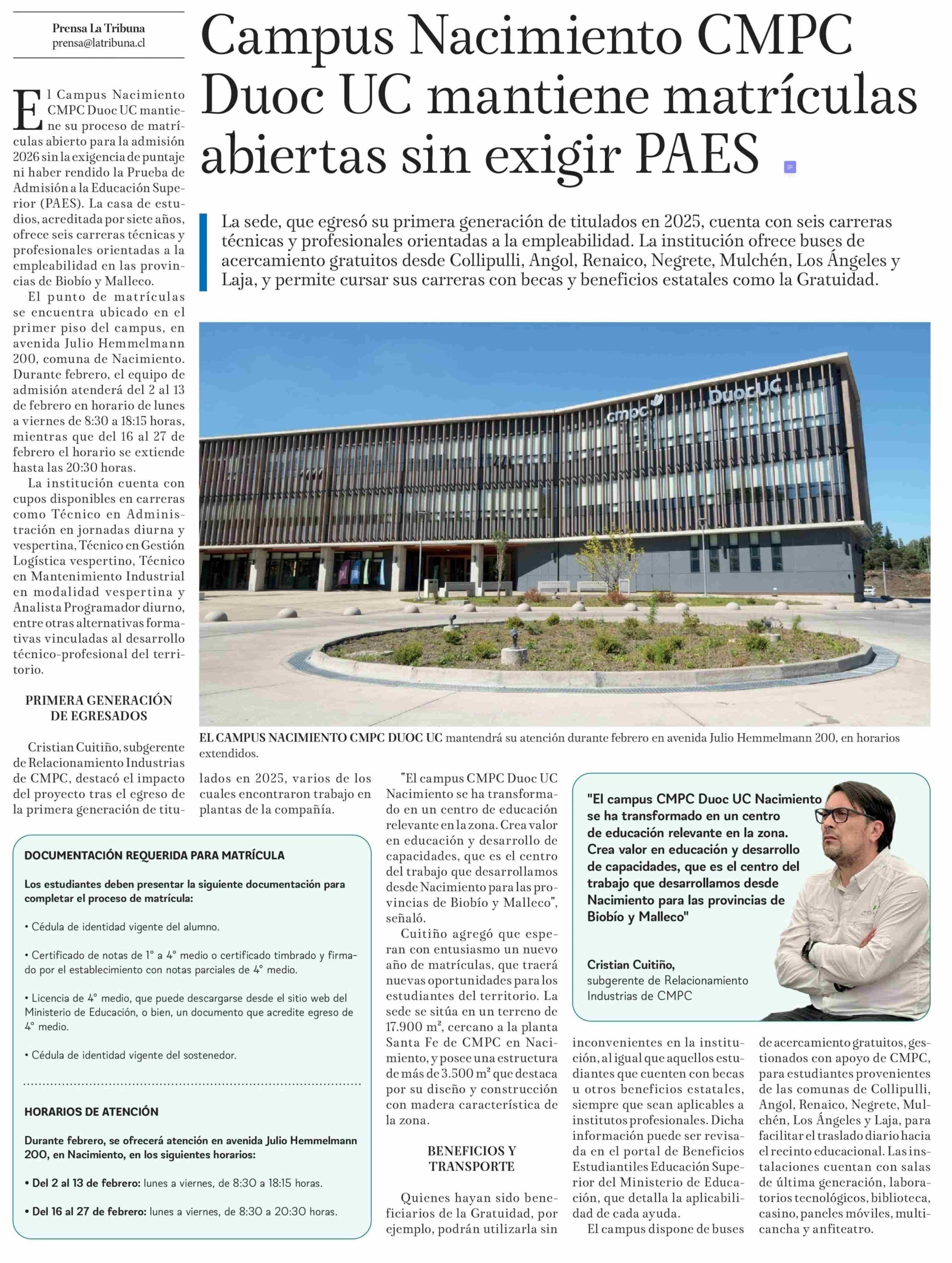 Campus Nacimiento CMPC Duoc UC mantiene matrículas abiertas sin exigir PAES