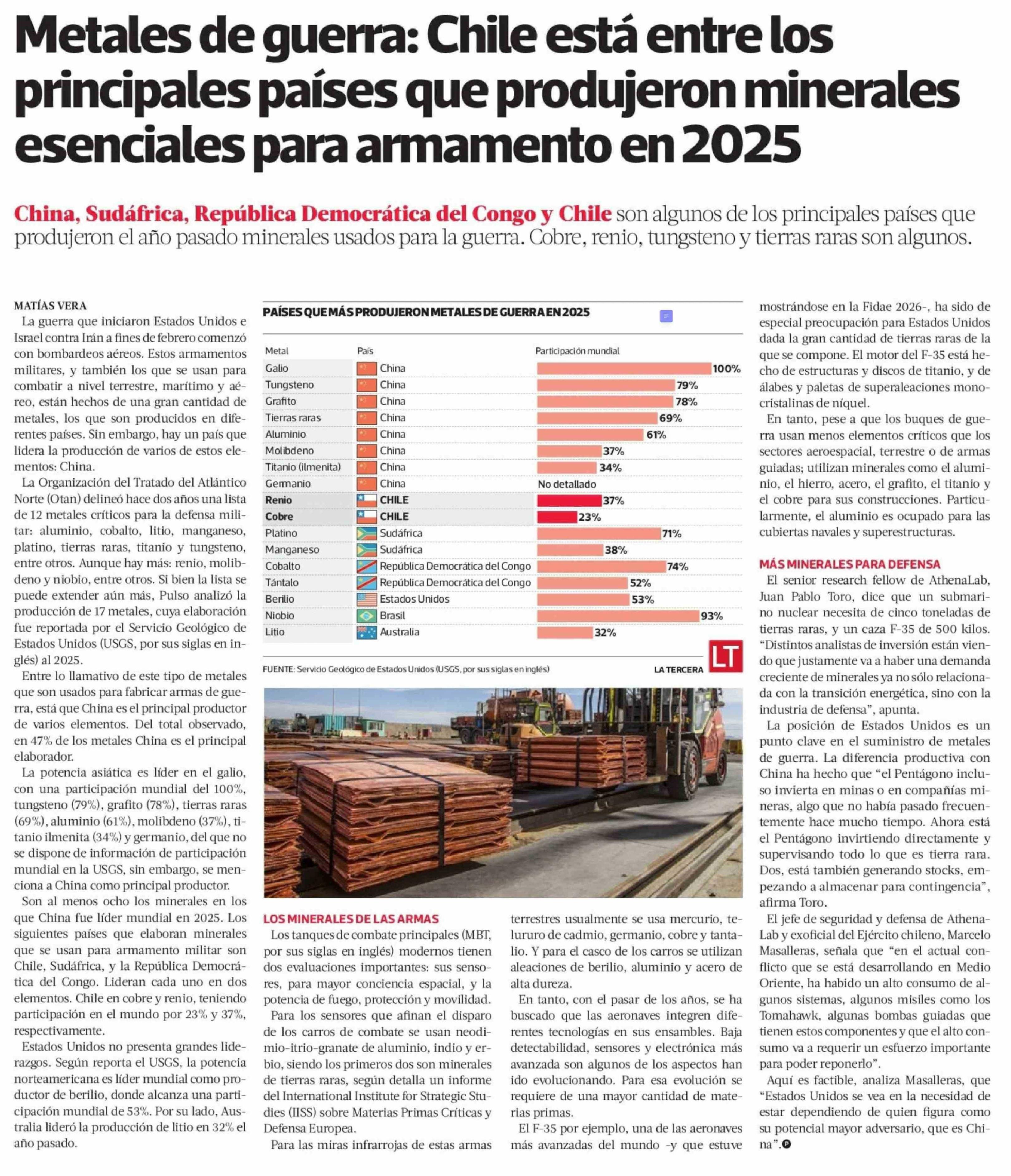 Título: Metales de guerra: Chile está entre los principales países que produjeron minerales esenciales para armamento en 2025