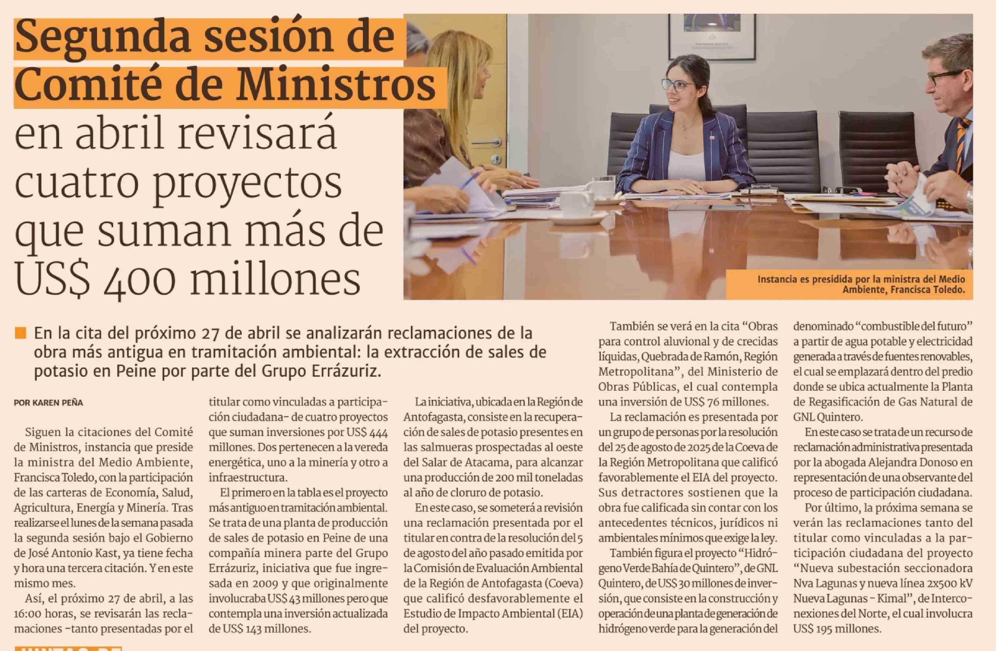 Segunda sesión de Comité de Ministros en abril revisará cuatro proyectos que suman más de US$ 400 millones