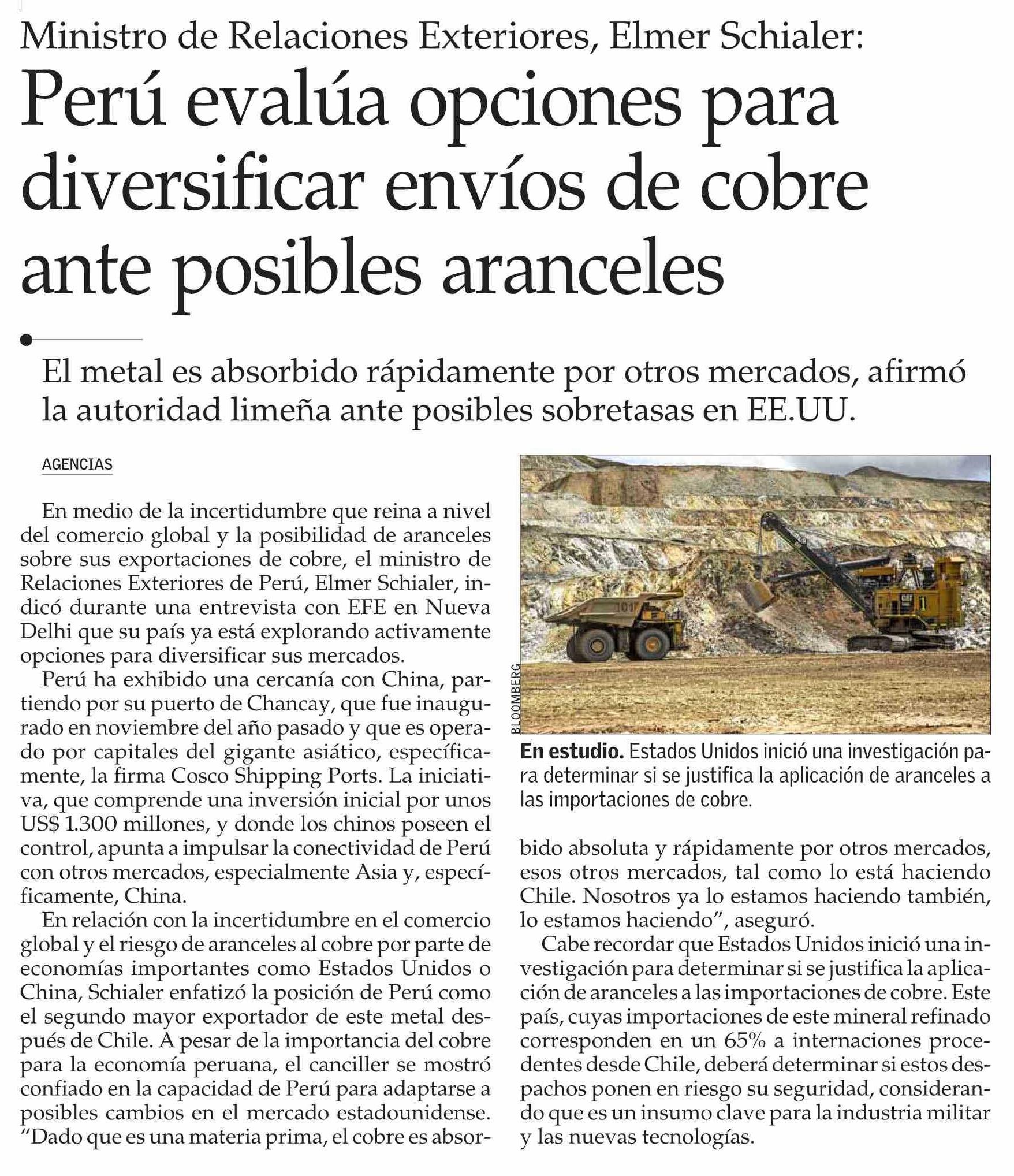 Perú evalúa opciones para diversificar envíos de cobre ante posibles aranceles