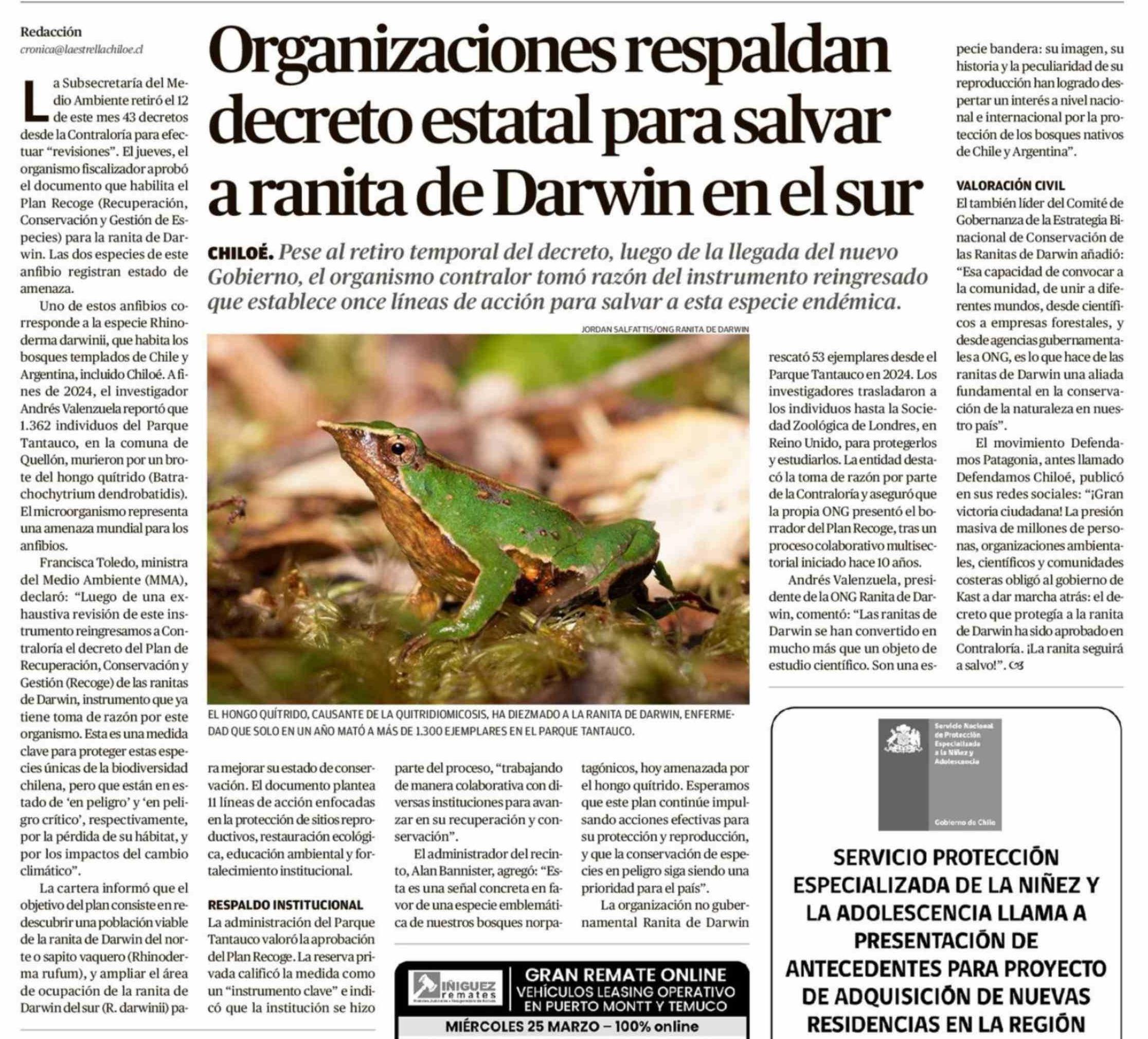 Organizaciones respaldan decreto estatal para salvar a ranita de Darwin en el sur