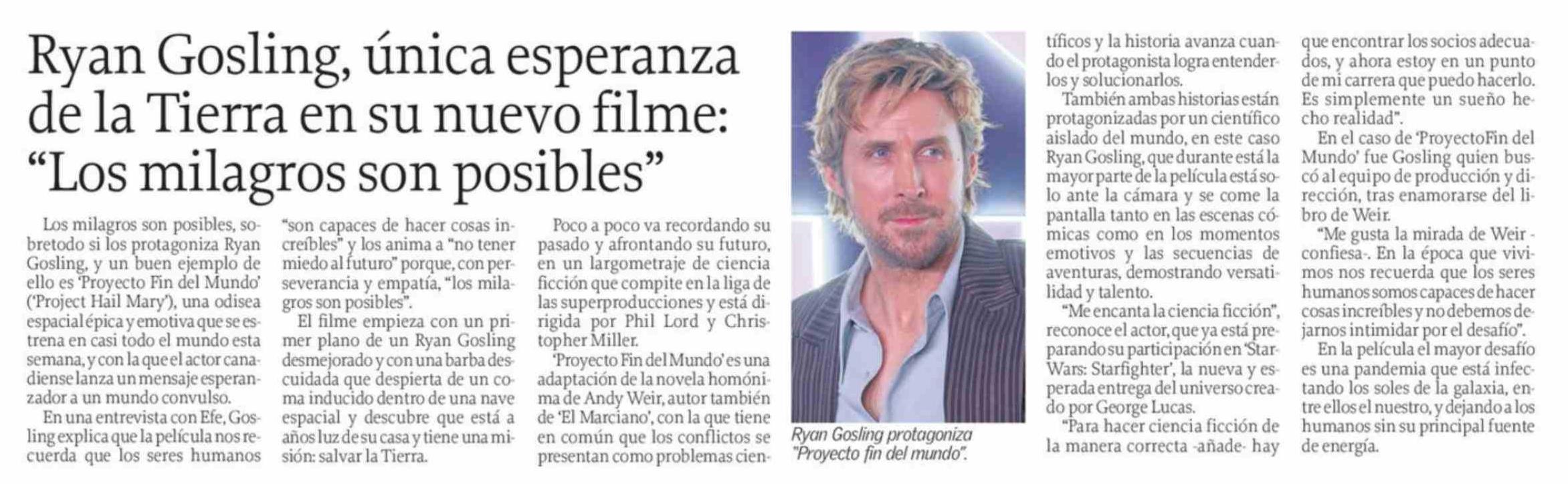 Título: Ryan Gosling, única esperanza de la Tierra en su nuevo filme: "Los milagros son posibles"