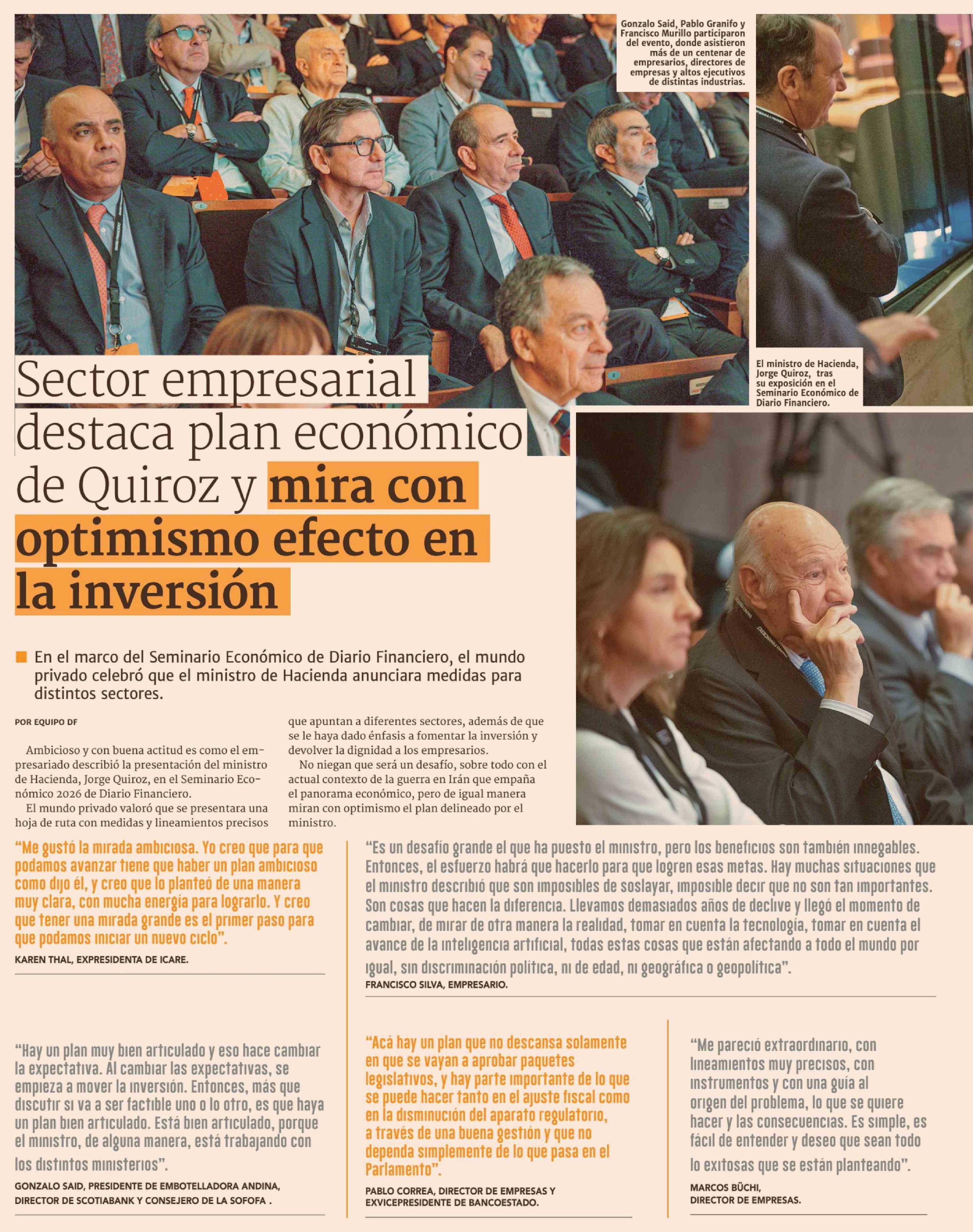 Sector empresarial destaca plan económico de Quiroz y mira con optimismo efecto en la inversión