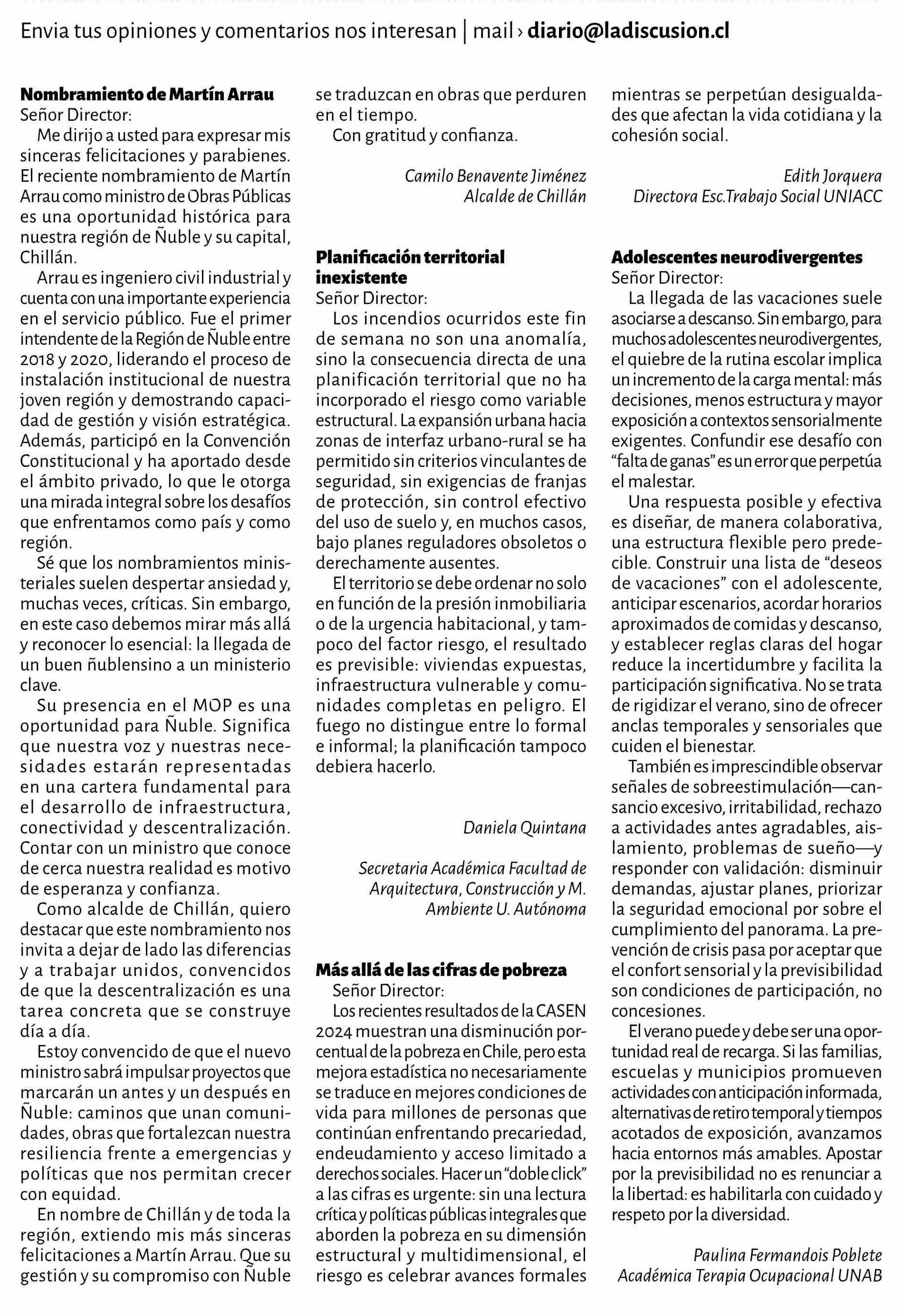Título: Cartas: Nombramiento de Martín Arrau Señor Director: Me dirijo a usted para expresar mis sinceras felicitaciones y parabienes. El reciente nombramiento de Martín Arrau como ministro de Obras Publicas es una oportunidad histórica para nuestra región de Nuble y su capital, Chillán. Arrau es ingeniero