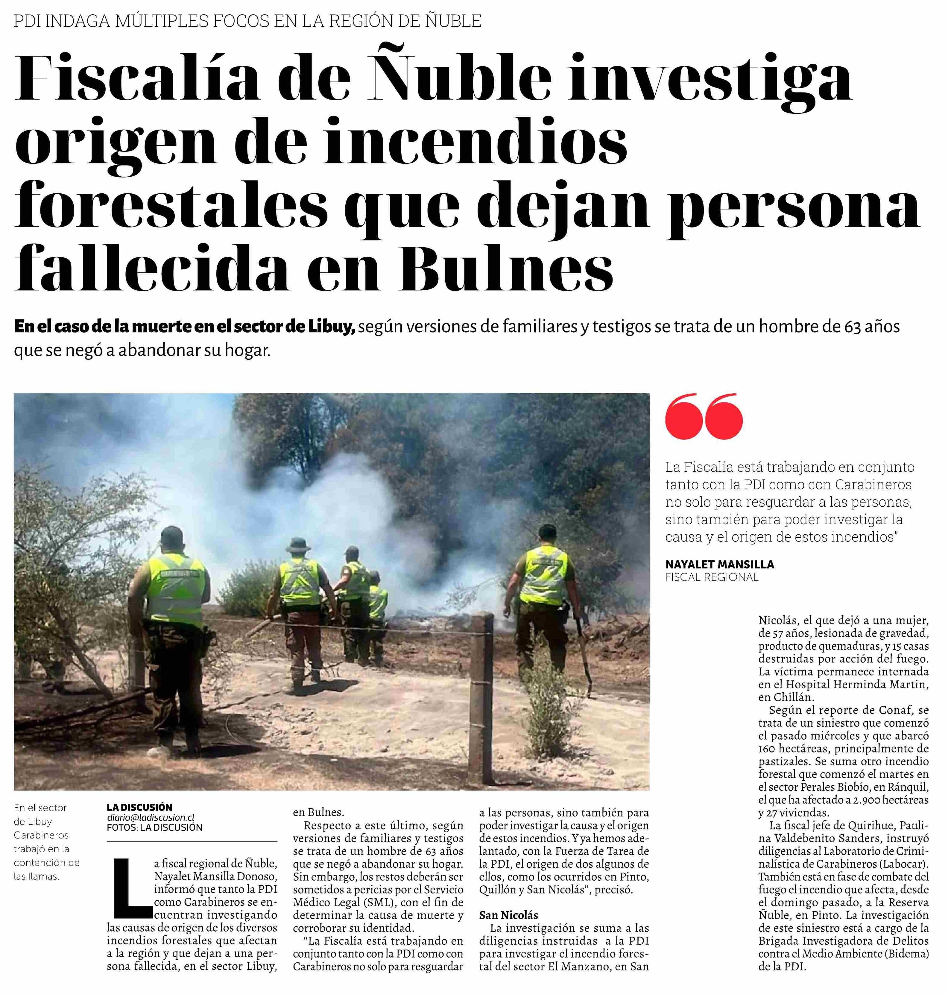 Título: Fiscalía de Ñuble investiga origen de incendios forestales que dejan persona fallecida en Bulnes