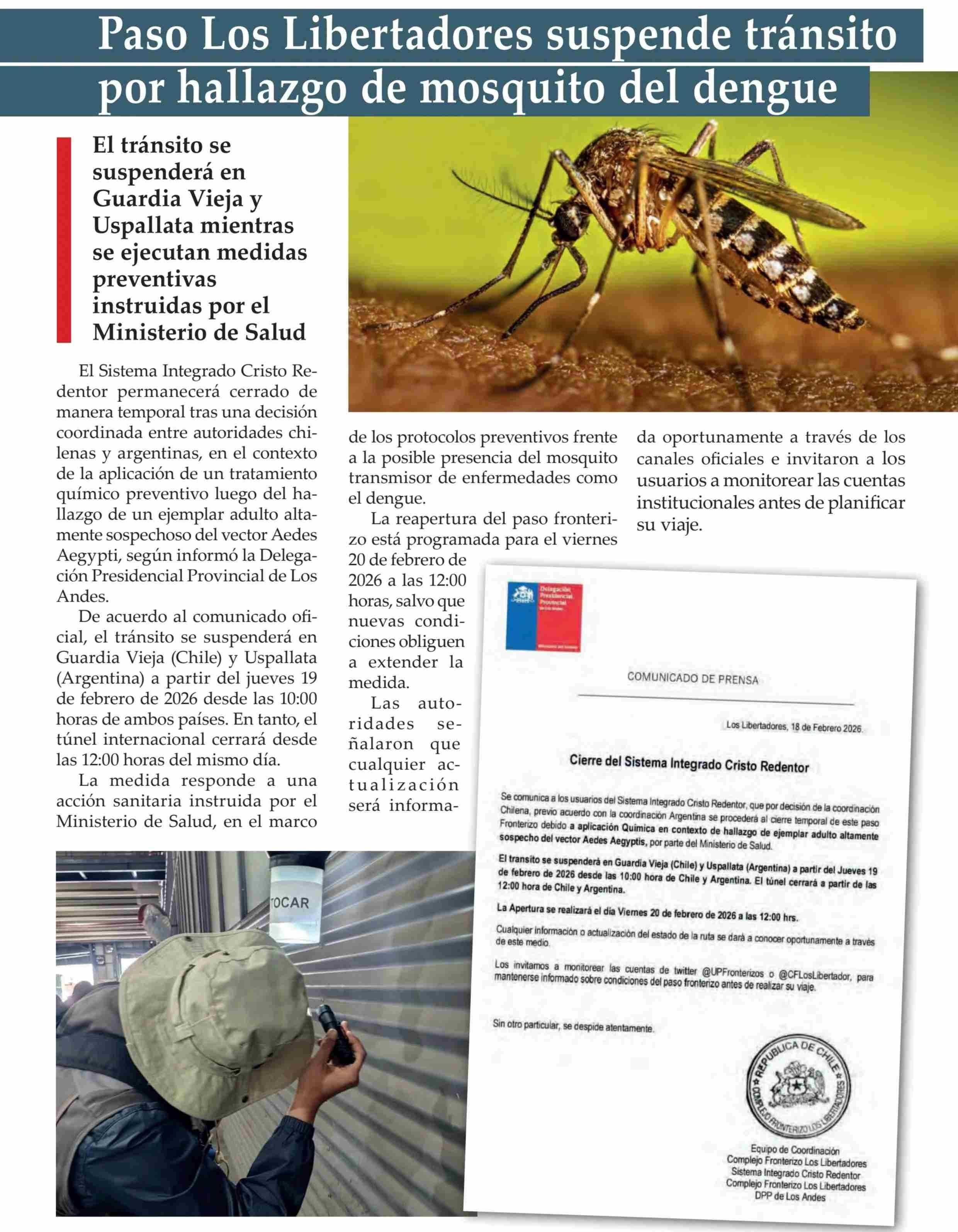 Paso Los Libertadores suspende tránsito por hallazgo de mosquito del dengue