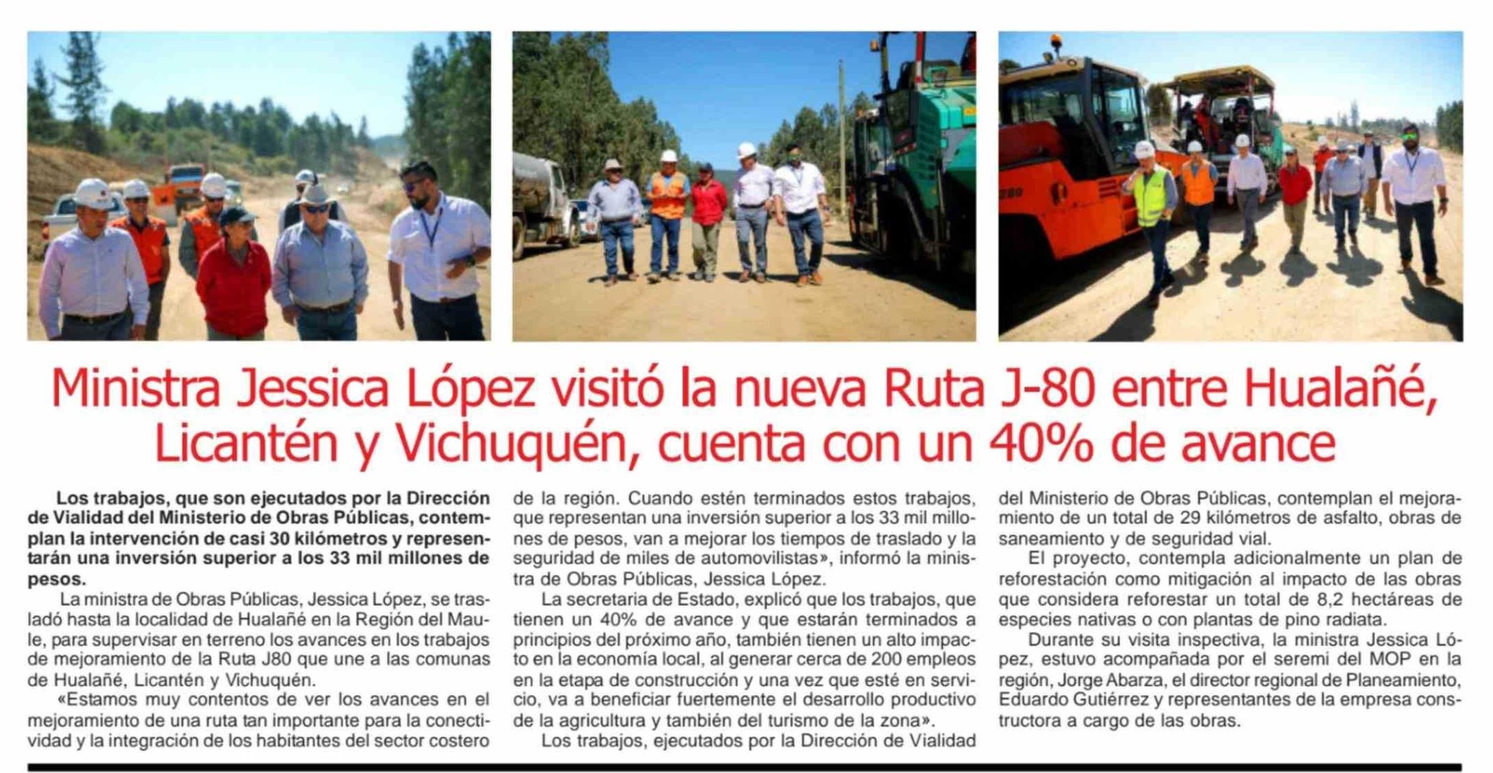 Ministra Jessica López visitó la nueva Ruta J-80 entre Hualañé, Licantén y Vichuquén, cuenta con un 40% de avance