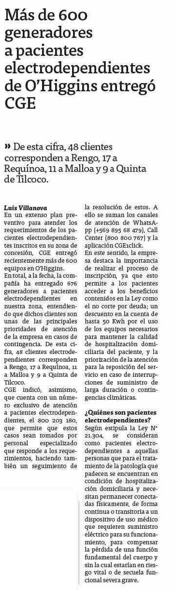 Más de 600 generadores a pacientes electrodependientes de O'Higgins entregó CGE