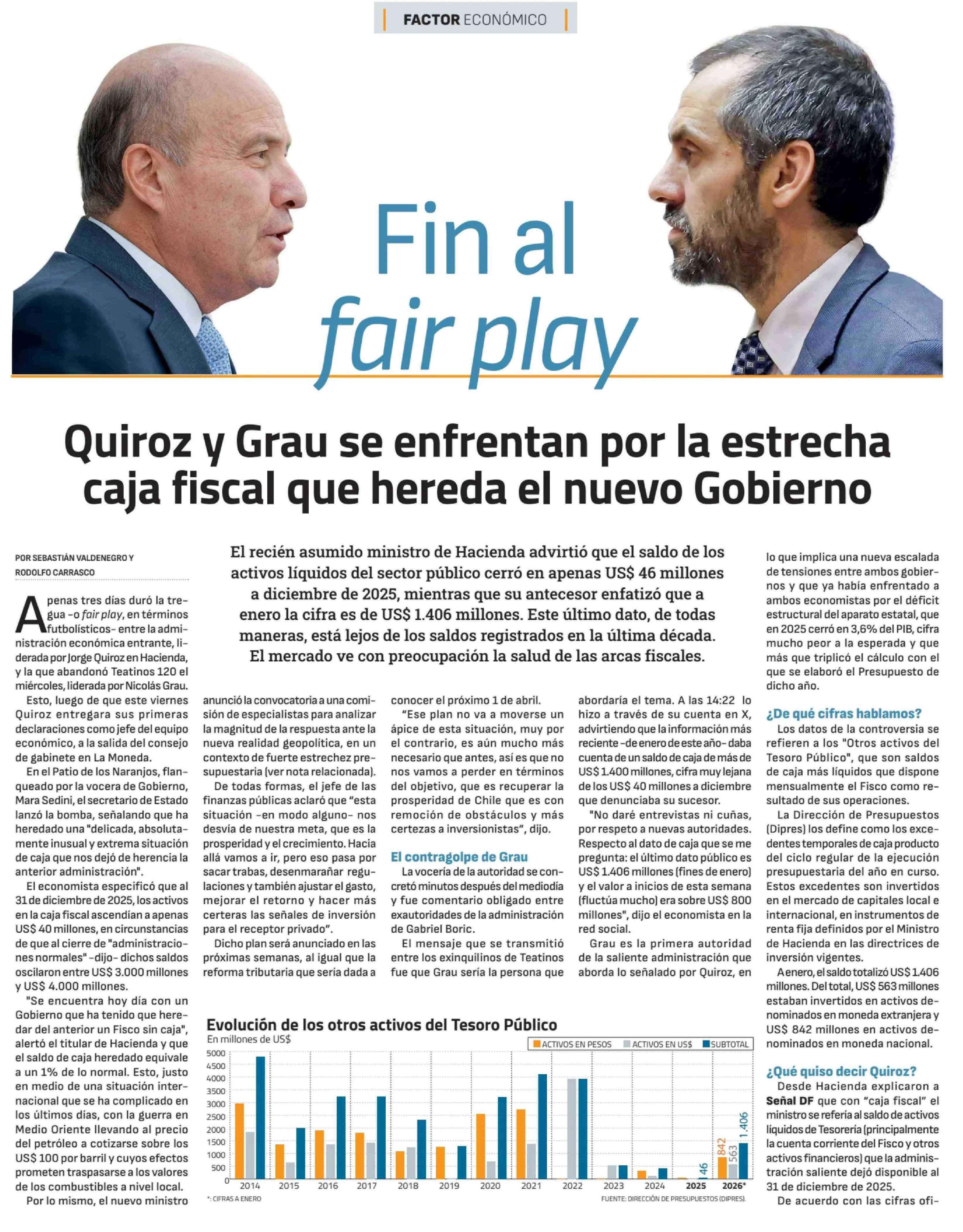 Quiroz y Grau se enfrentan por la estrecha caja fiscal que hereda el nuevo Gobierno