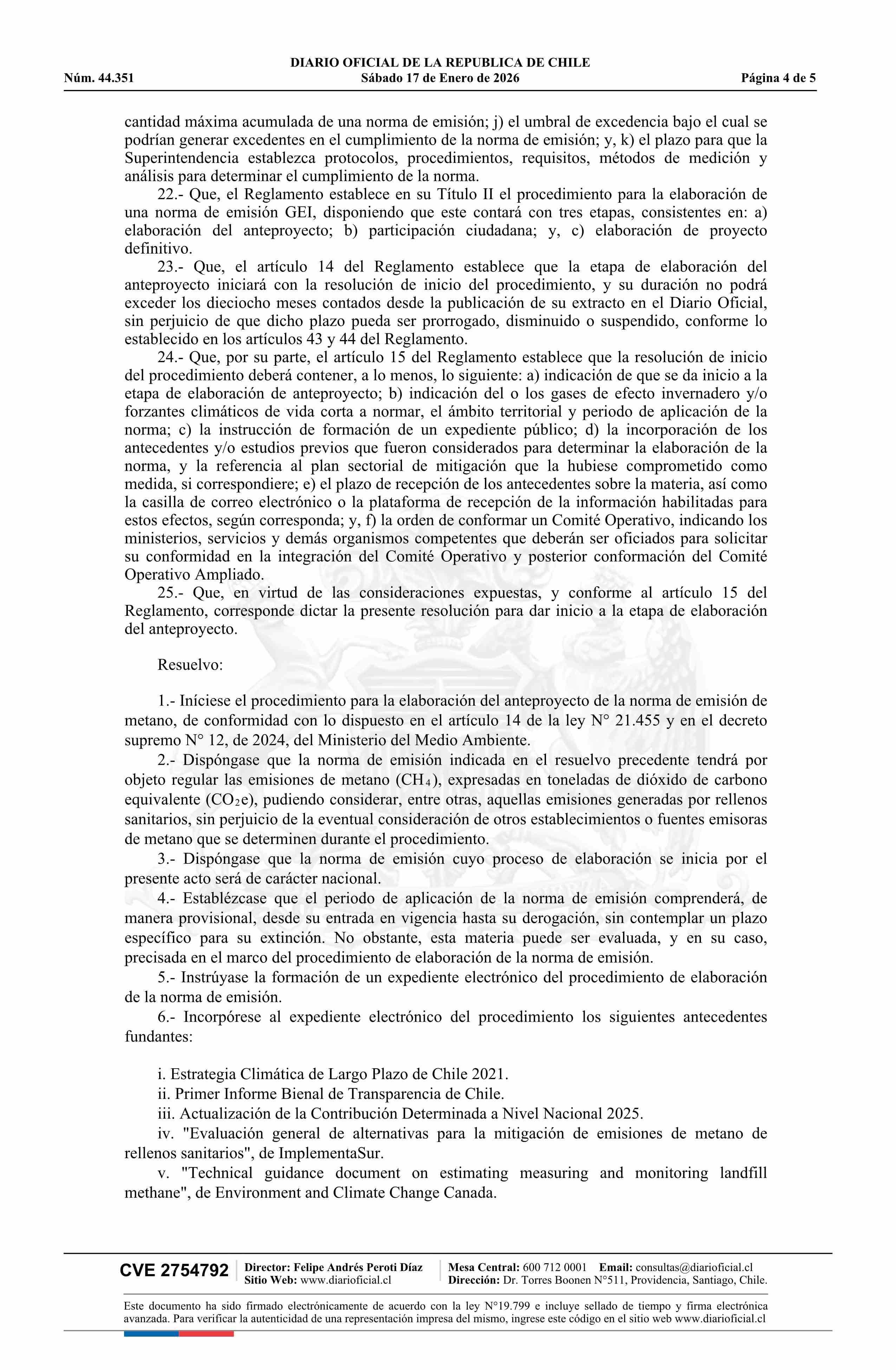| Título: | Resolución exenta número 9.633, de 2025.- Inicia procedimiento de elaboración del anteproyecto de la norma de emisión de metano |