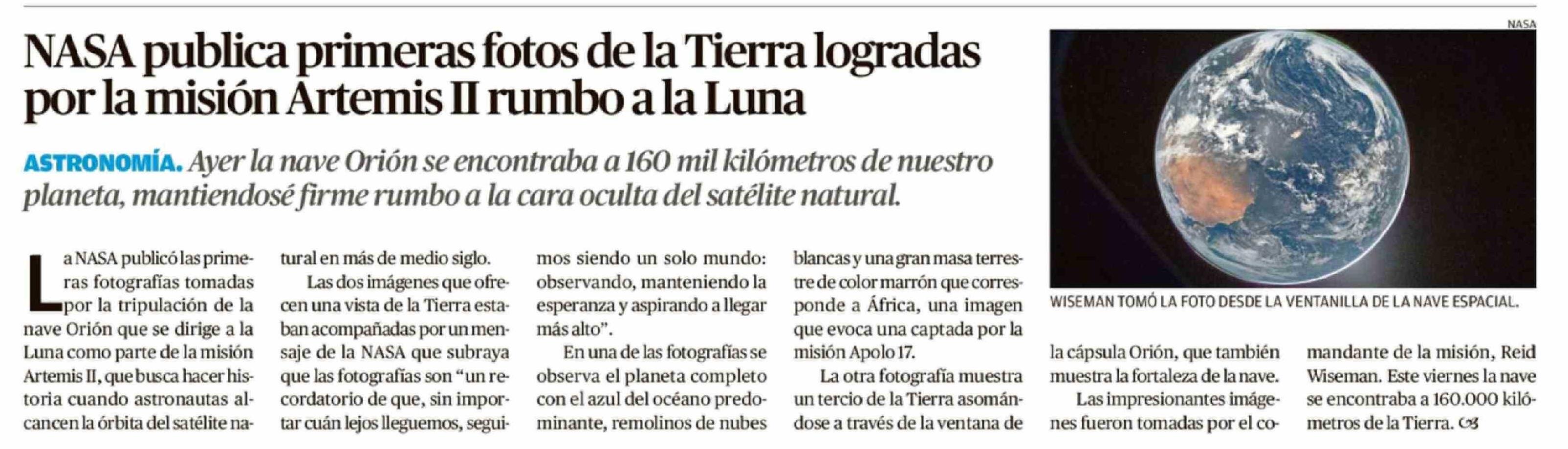 NASA publica primeras fotos de la Tierra logradas por la misión Artemis II rumbo a la Luna