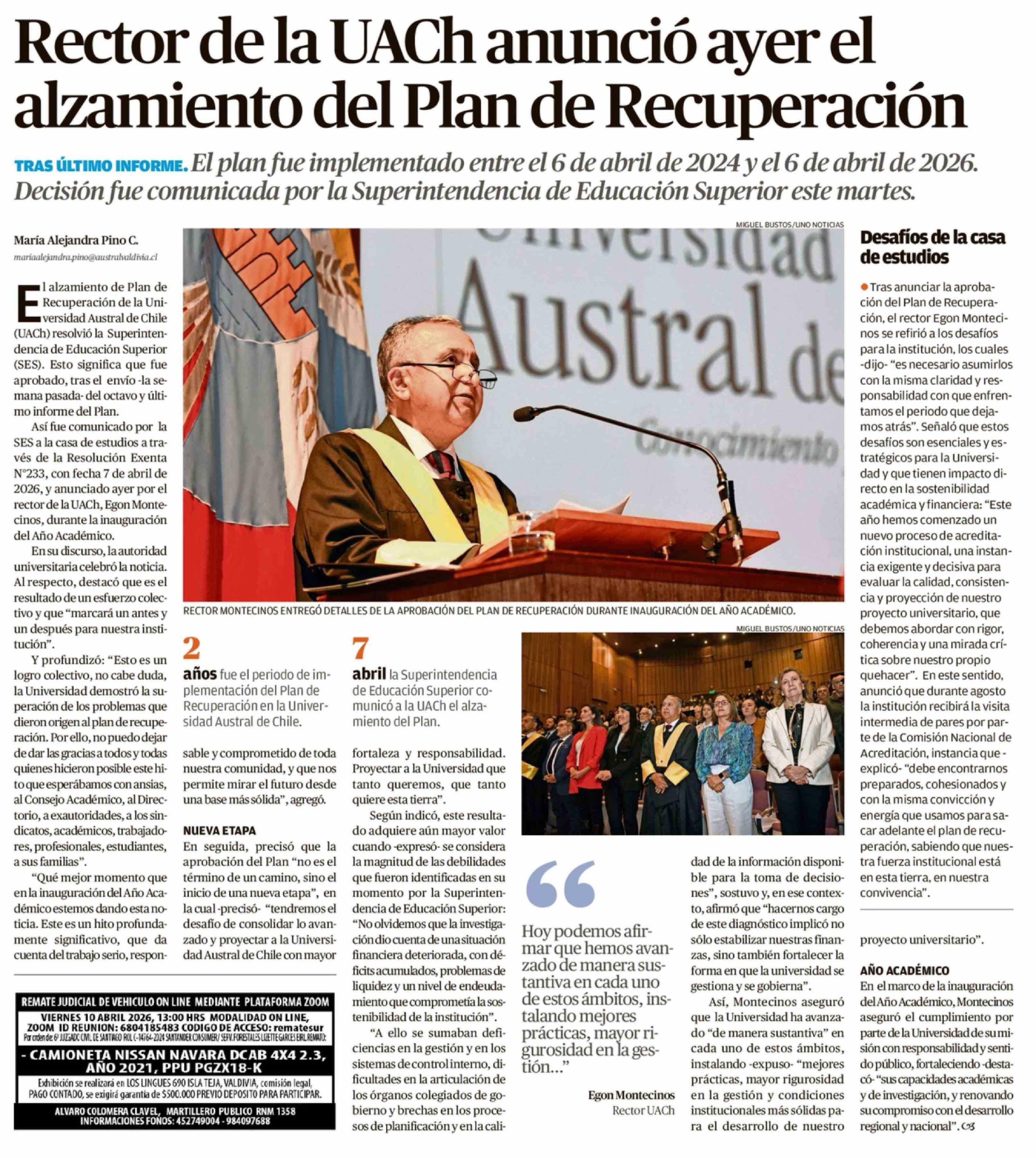 Rector de la UACh anunció ayer el alzamiento del Plan de Recuperación