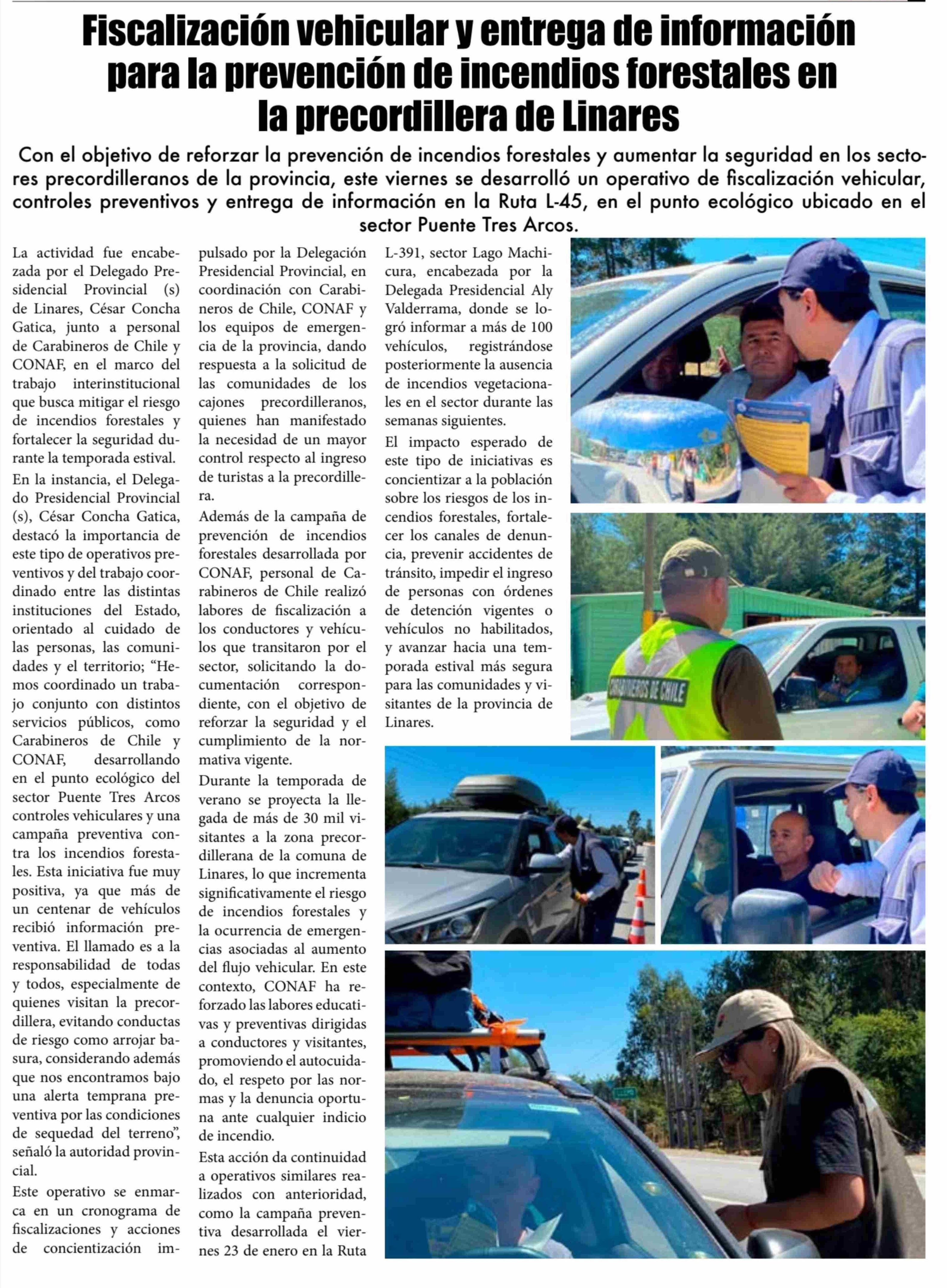 Fiscalización vehicular y entrega de información para la prevención de incendios forestales en la precordillera de Linares