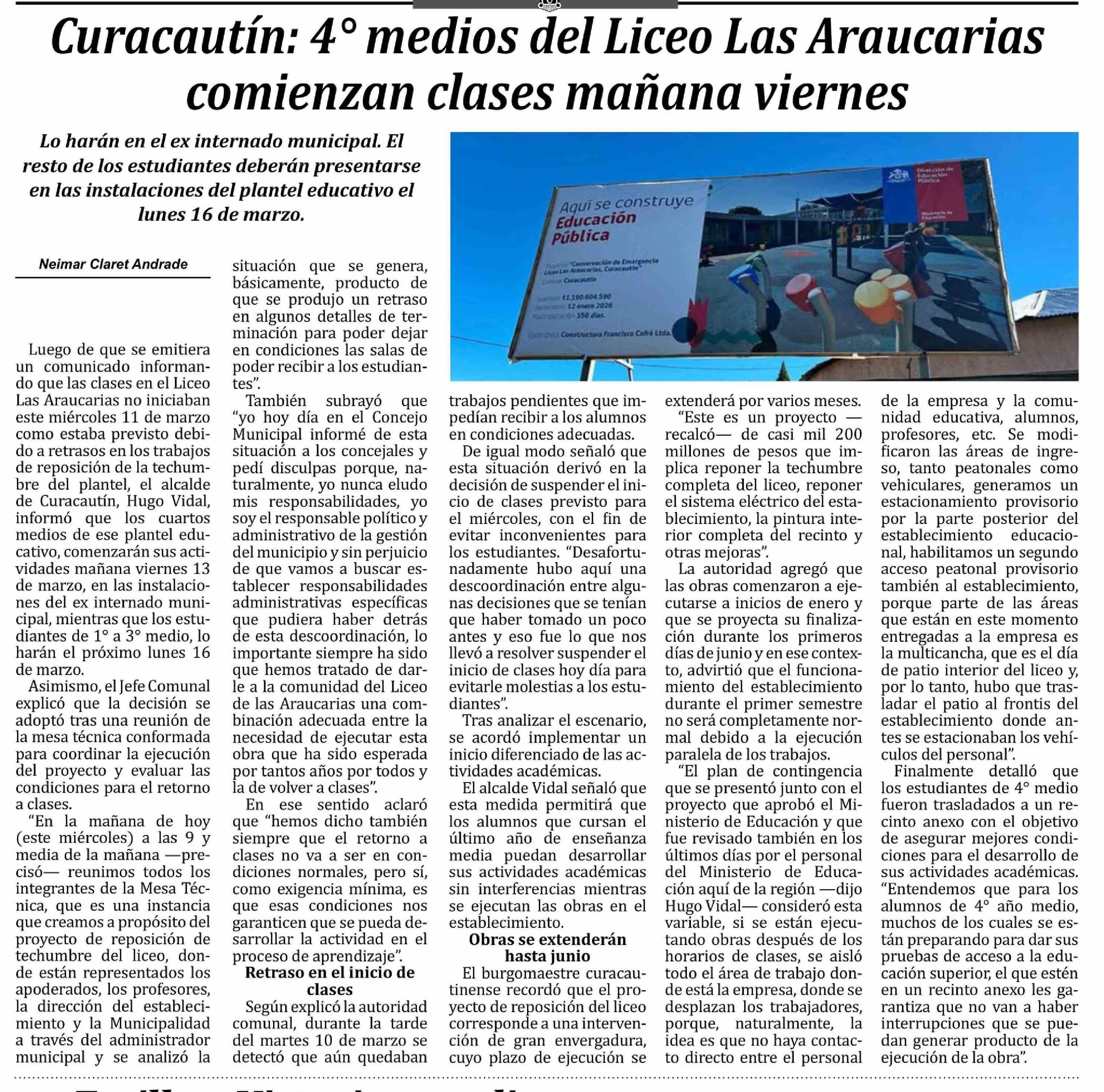 Curacautín: 4º medios del Liceo Las Araucarias comienzan clases mañana viernes