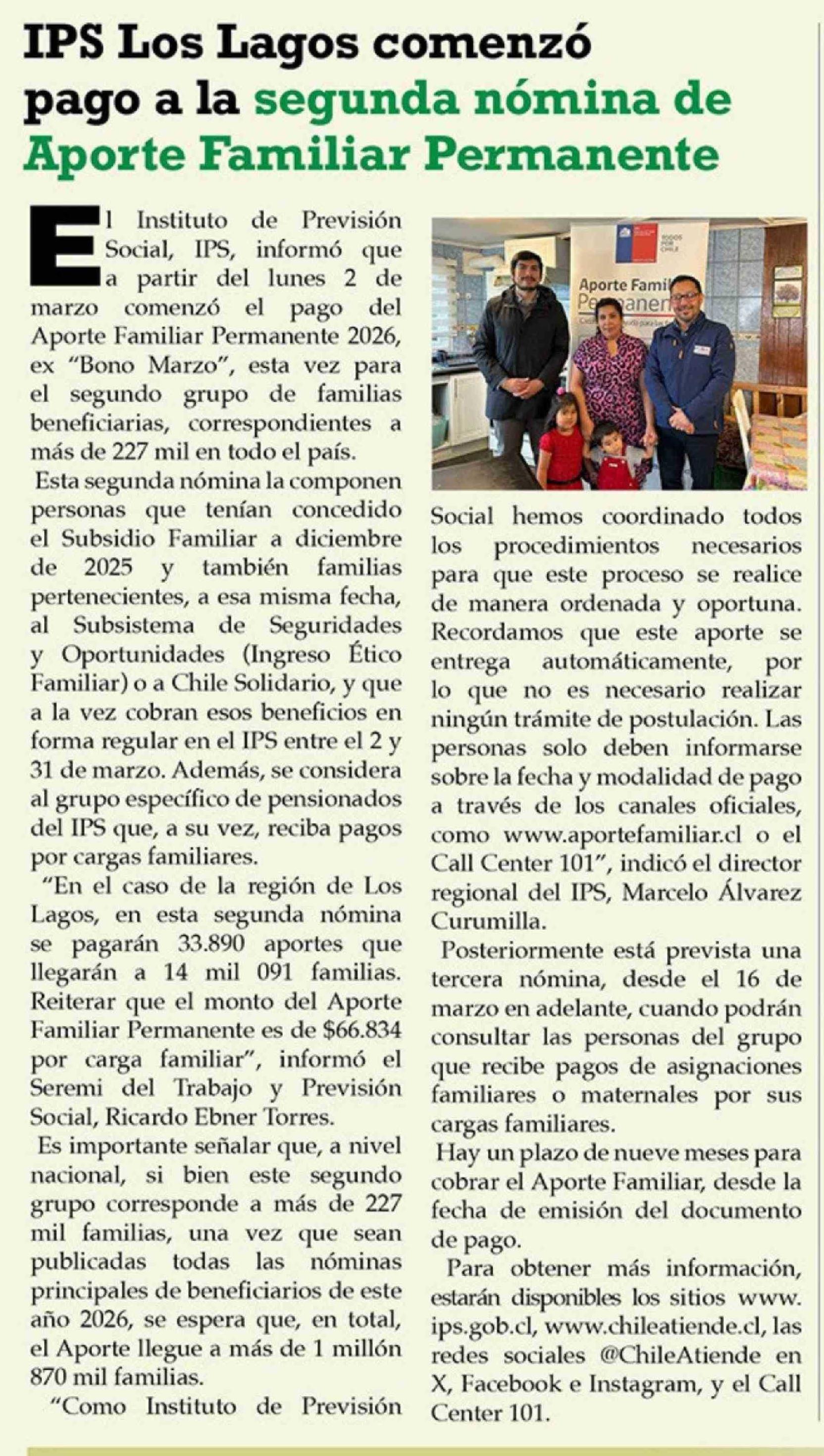 IPS Los Lagos comenzó pago a la segunda nómina de Aporte Familiar Permanente