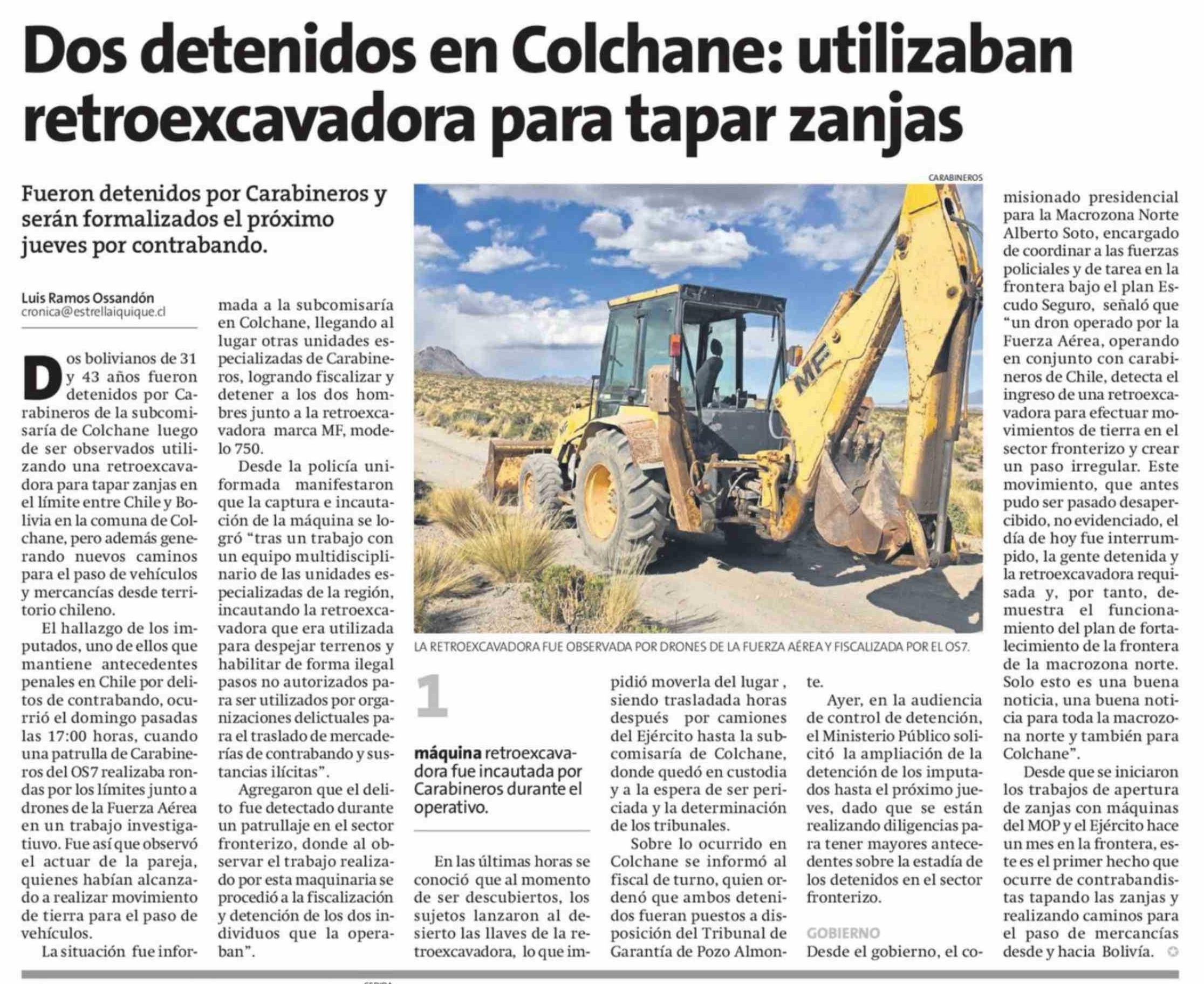 Dos detenidos en Colchane: utilizaban retroexcavadora para tapar zanjas