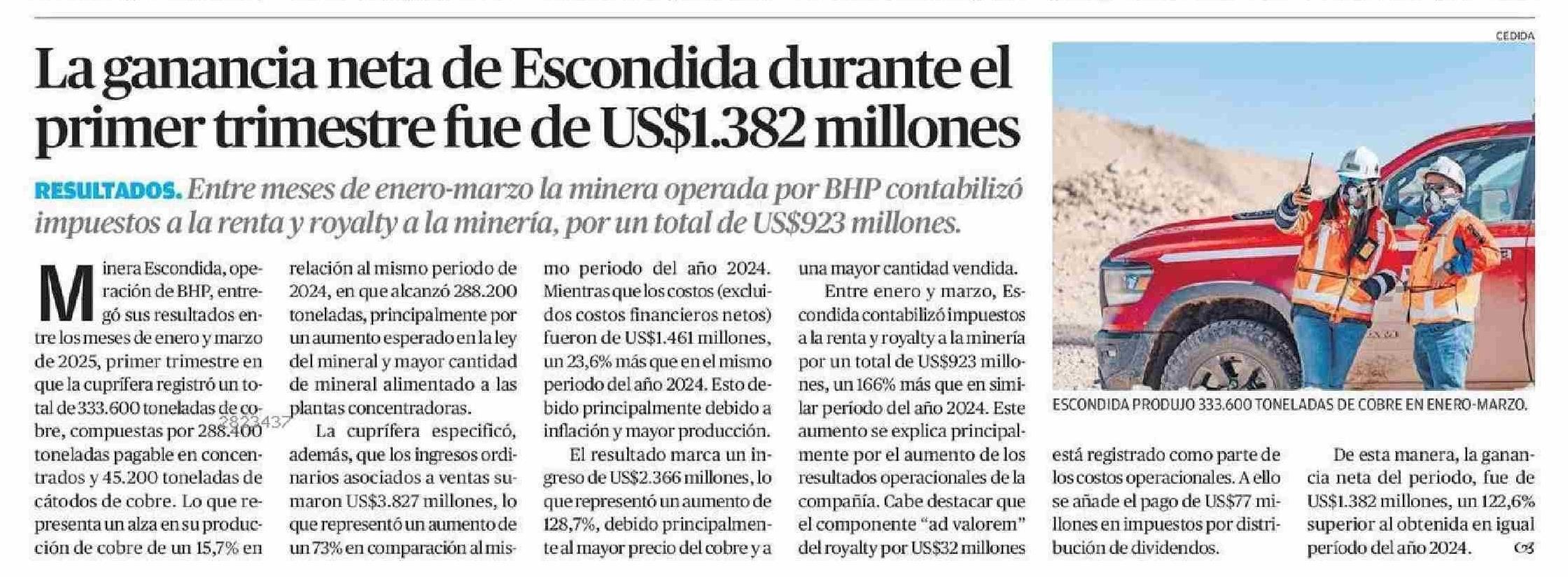 La ganancia neta de Escondida durante el primer trimestre fue de US$1.382 millones