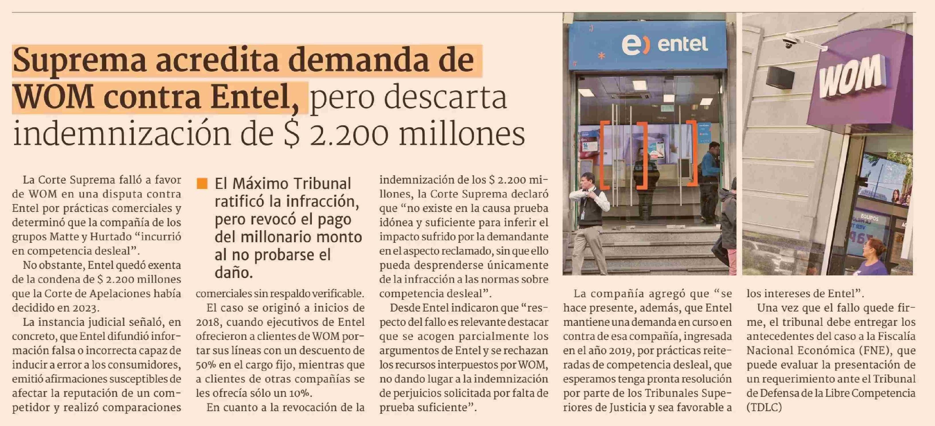 Suprema acredita demanda de WOM contra Entel, pero descarta indemnización de $ 2.200 millones