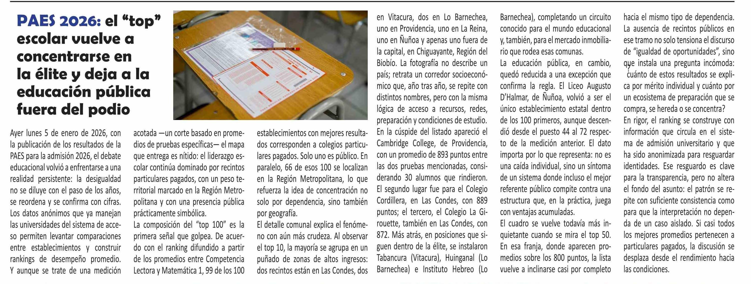 PAES 2026: el "top" escolar vuelve a concentrarse en la élite y deja a la educación pública fuera del podio