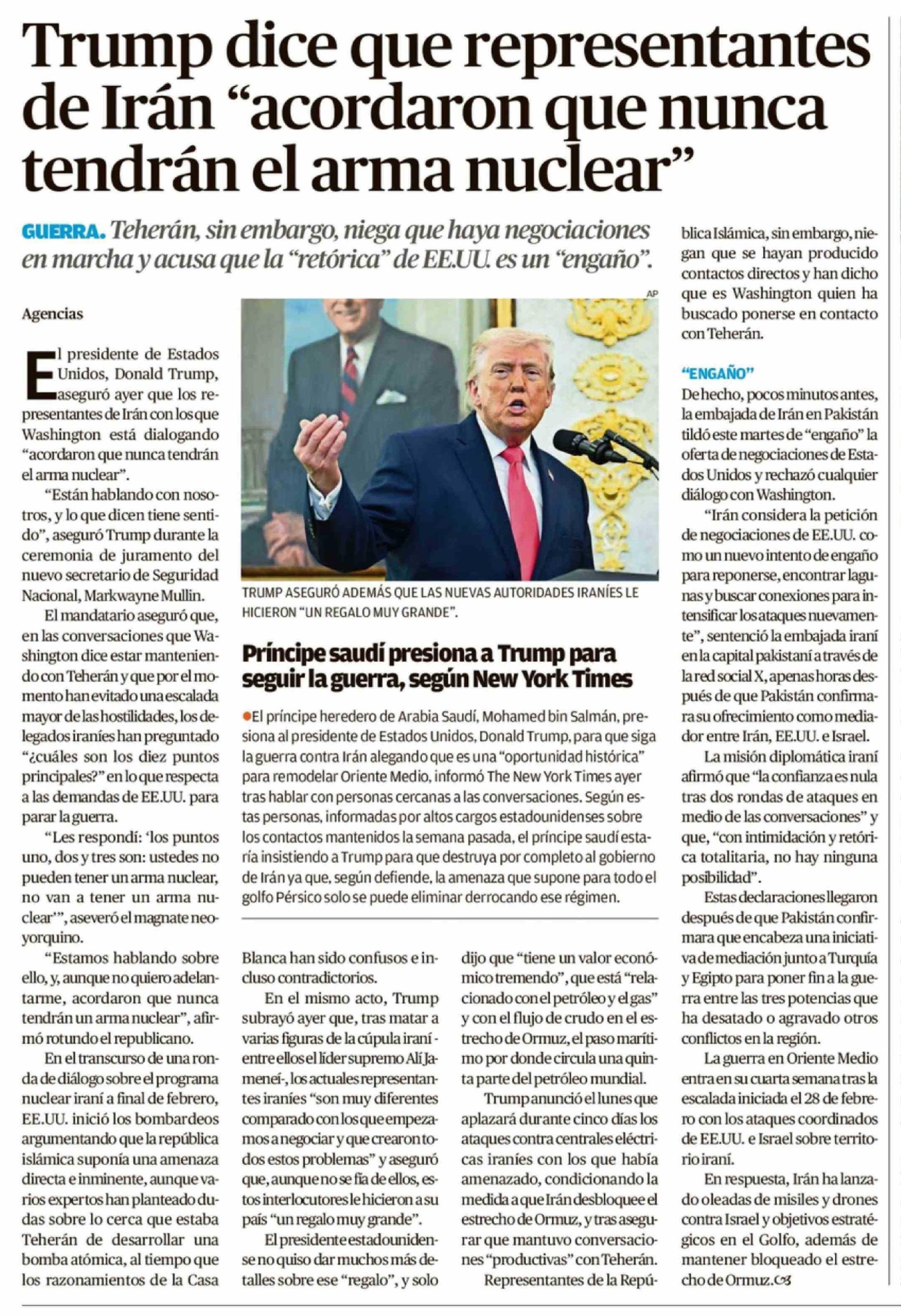 Trump dice que representantes de Irán "acordaron que nunca tendrán el arma nuclear"