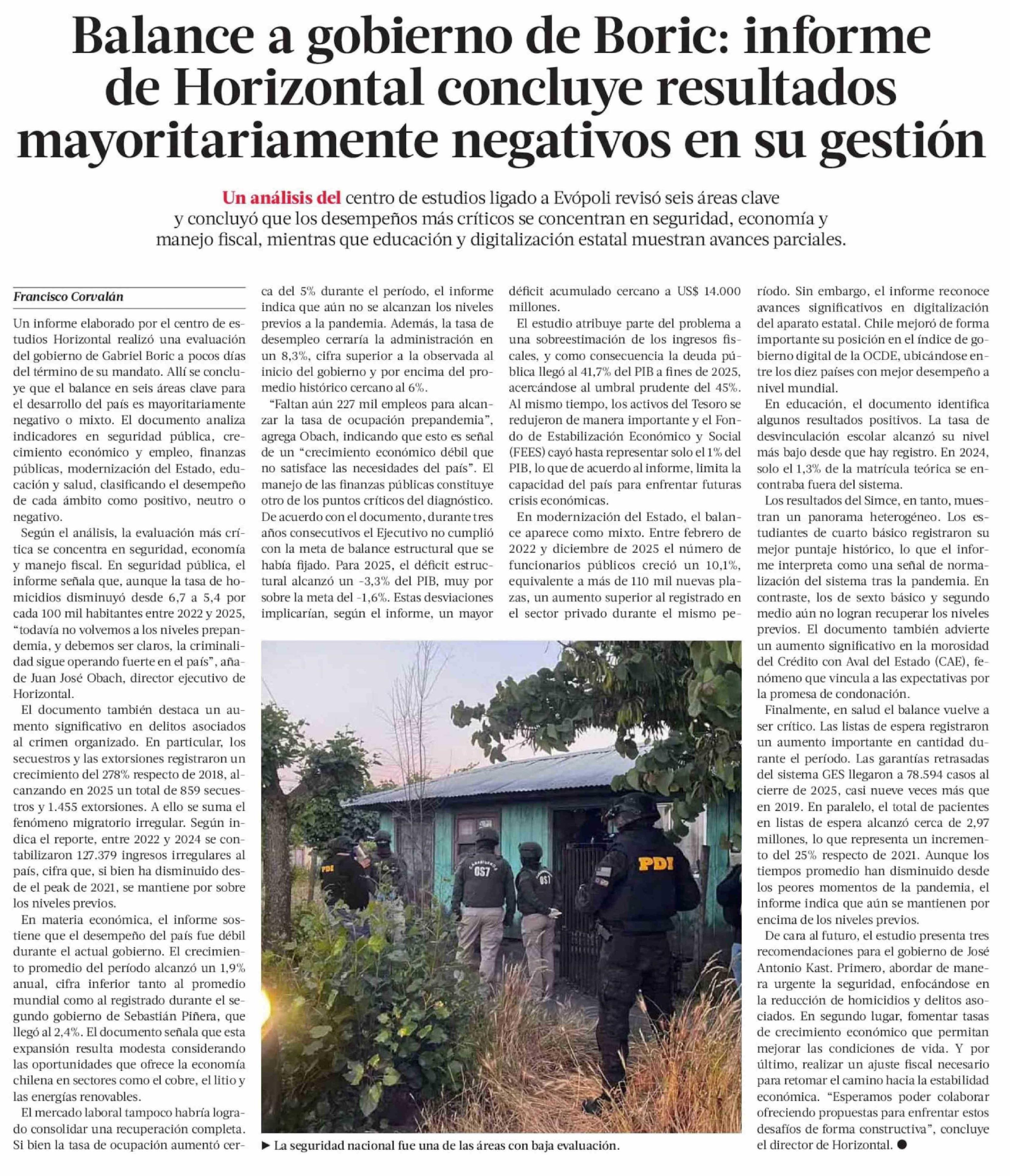 Balance a gobierno de Boric: informe de Horizontal concluye resultados mayoritariamente negativos en su gestión