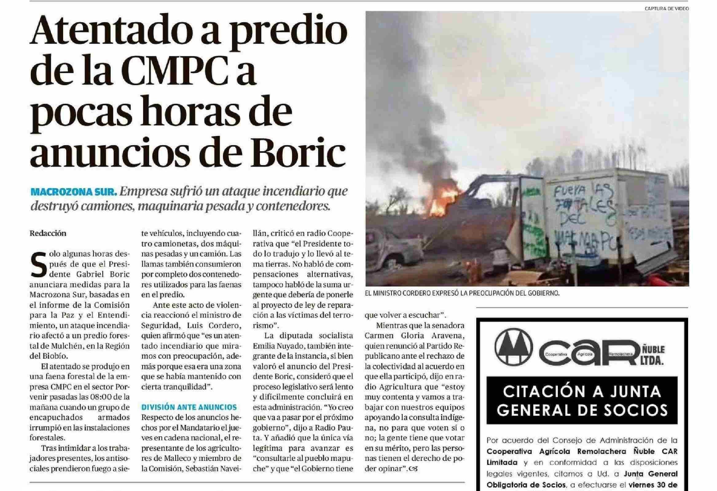 Atentado a predio de la CMPCa pocas horas de anuncios de Boric