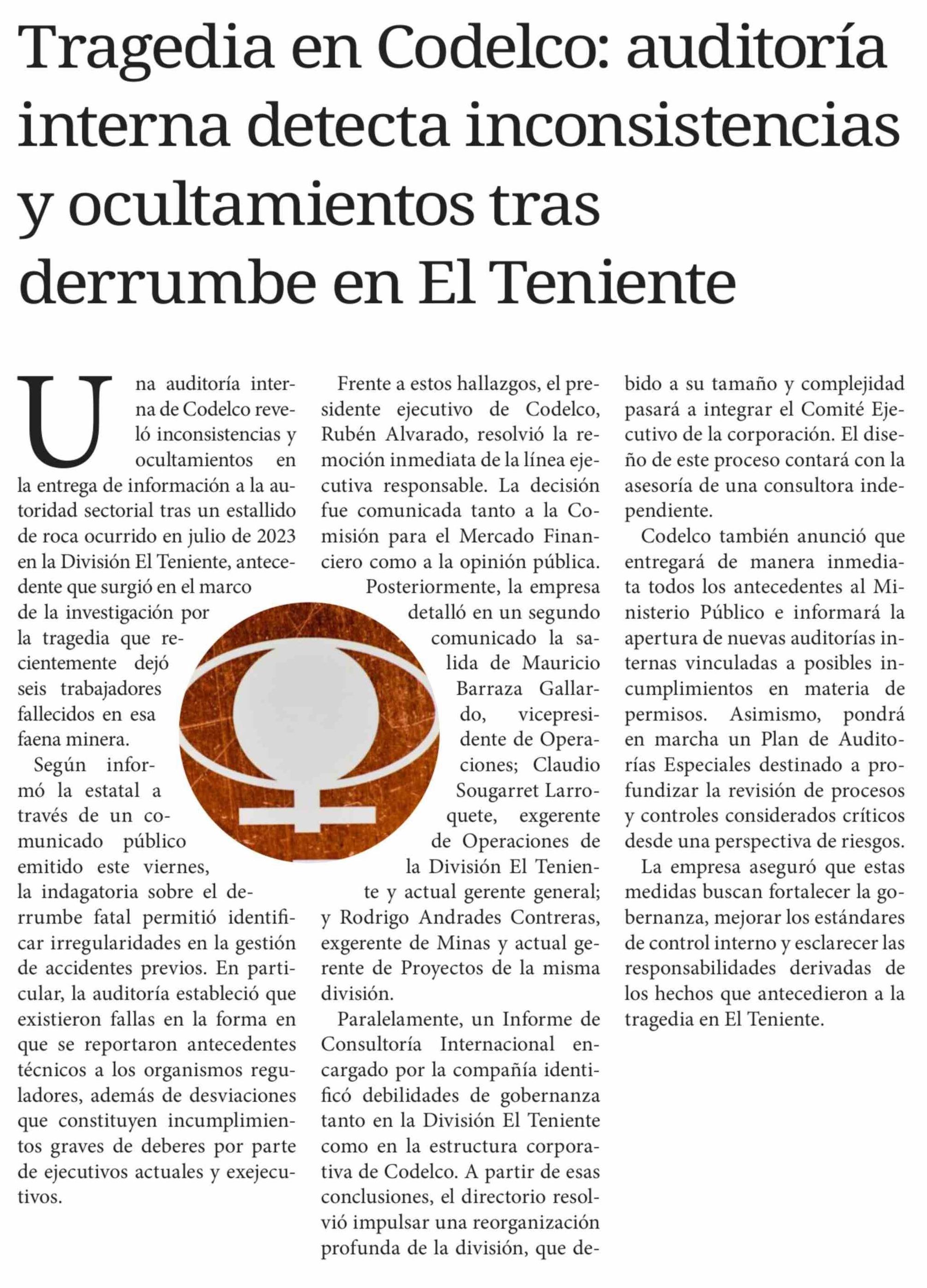 Tragedia en Codelco: auditoría interna detecta inconsistencias y ocultamientos tras derrumbe en El Teniente