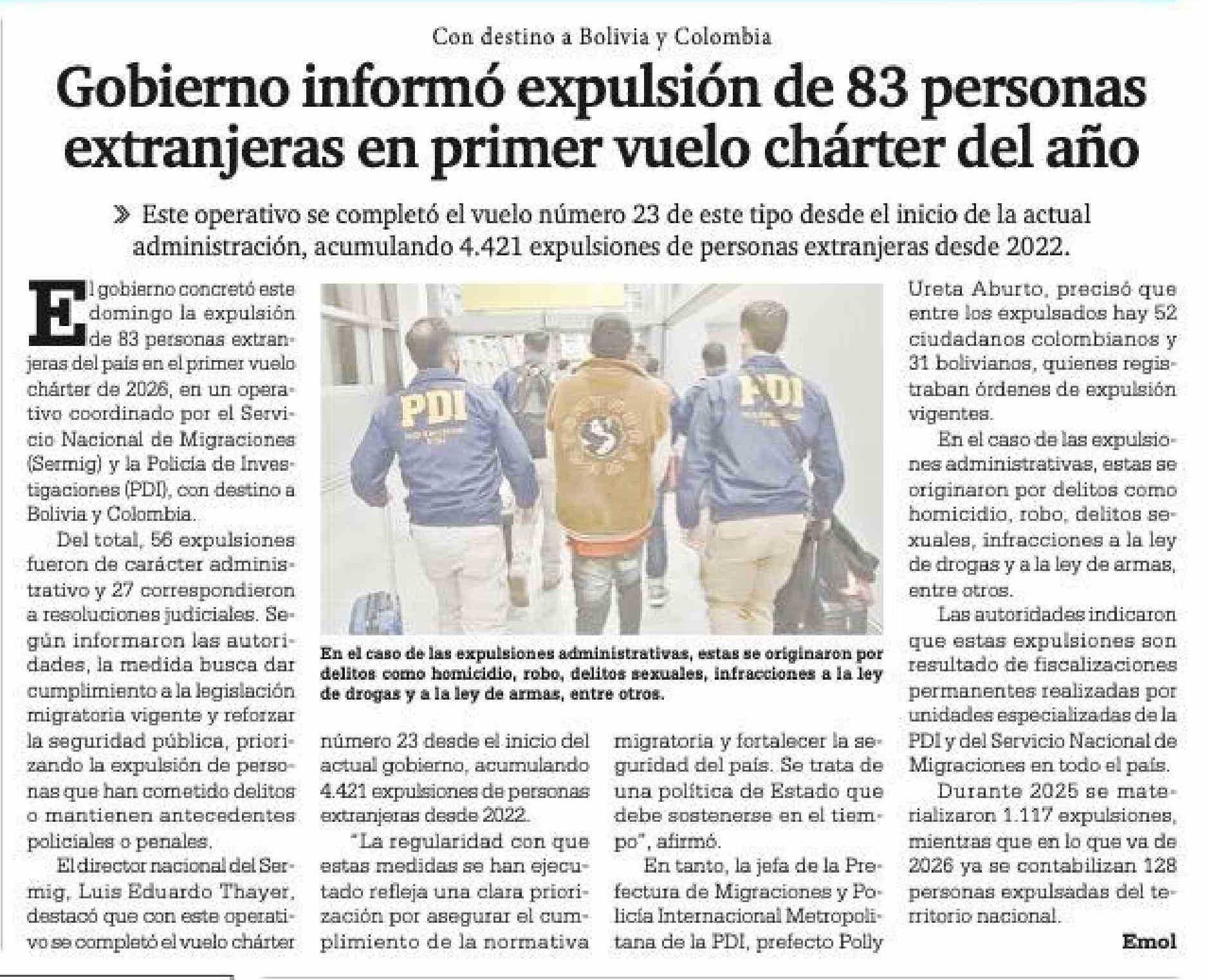Gobierno informó expulsión de 83 personas extranjeras en primer vuelo chárter del año