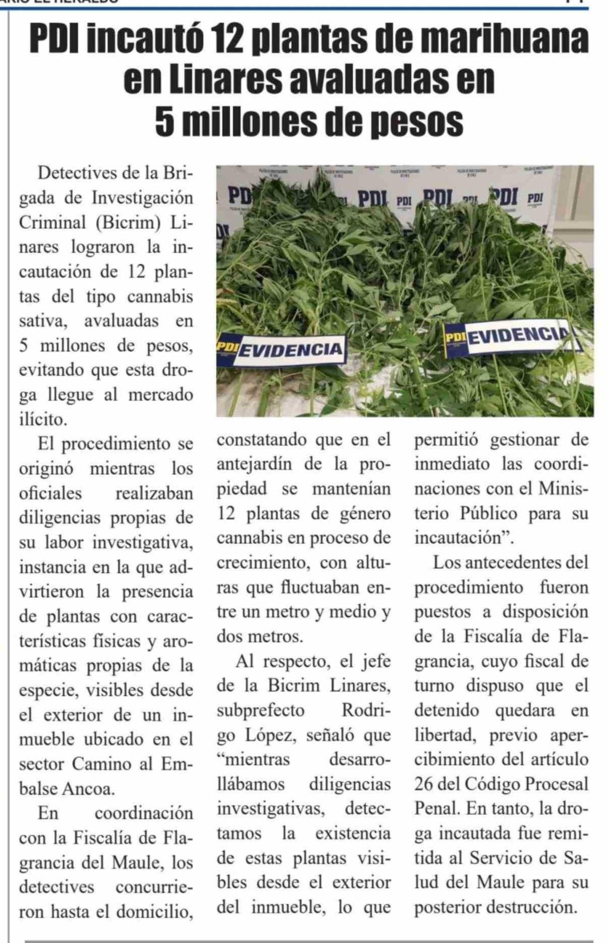 PDI incautó 12 plantas de marihuana en Linares avaluadas en 5 millones de pesos