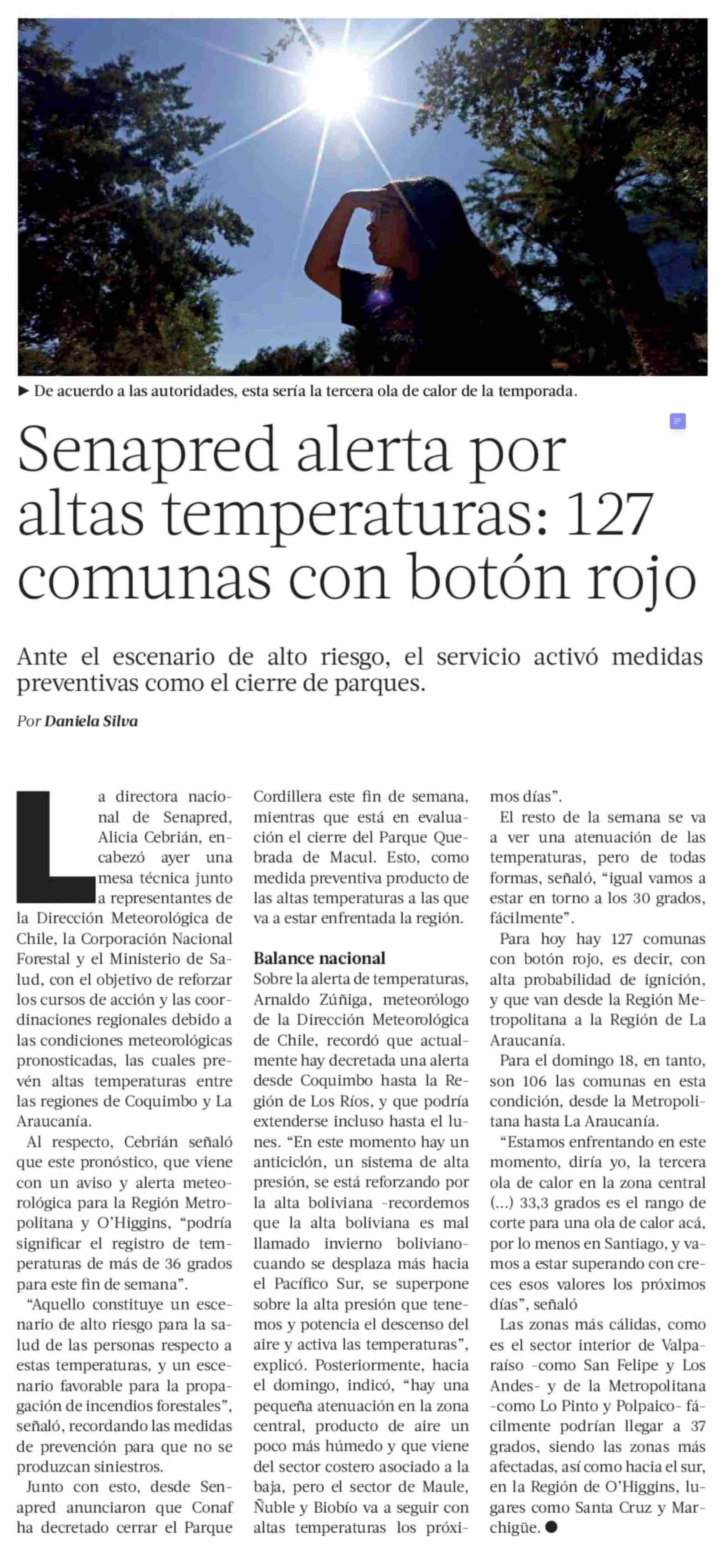 Senapred alerta por altas temperaturas: 127 comunas con botón rojo