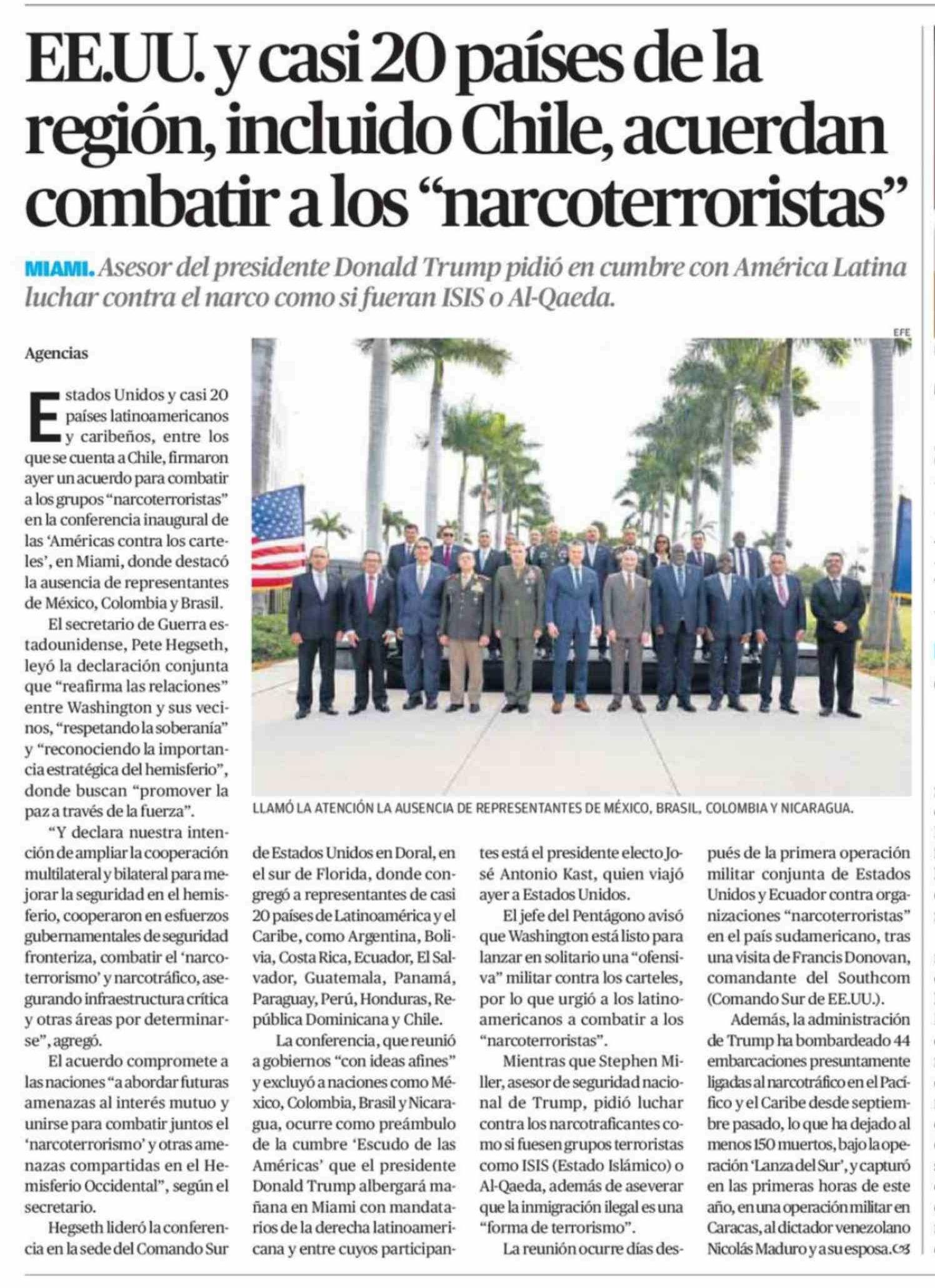 EE.UU. y casi 20 países de la región, incluido Chile, acuerdan combatir a los "narcoterroristas"