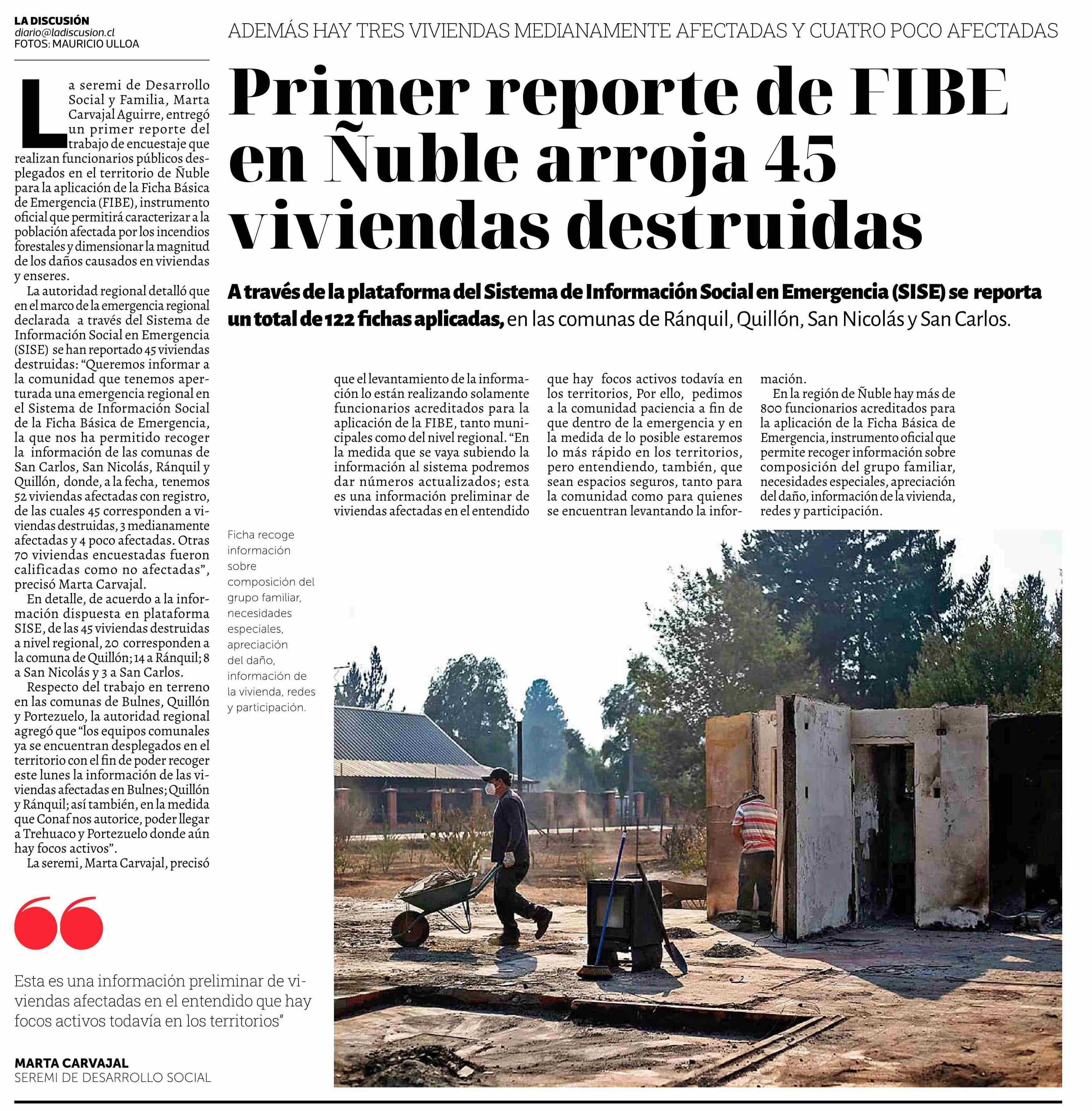 Primer reporte de FIBE en Ñuble arroja 45 viviendas destruidas
