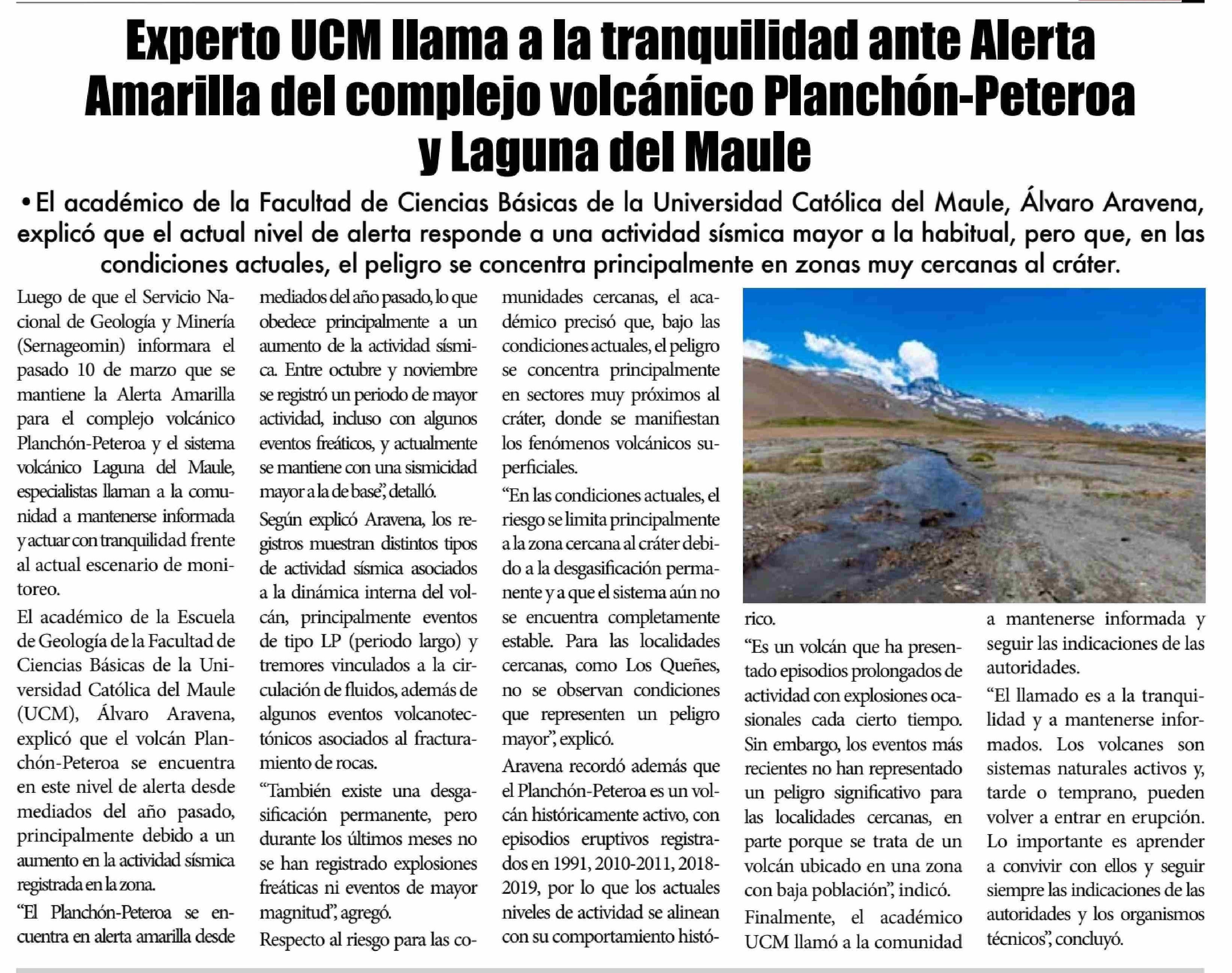 Experto UCM llama a la tranquilidad ante Alerta Amarilla del complejo volcanico Planchón-Peteroa y Laguna del Maule