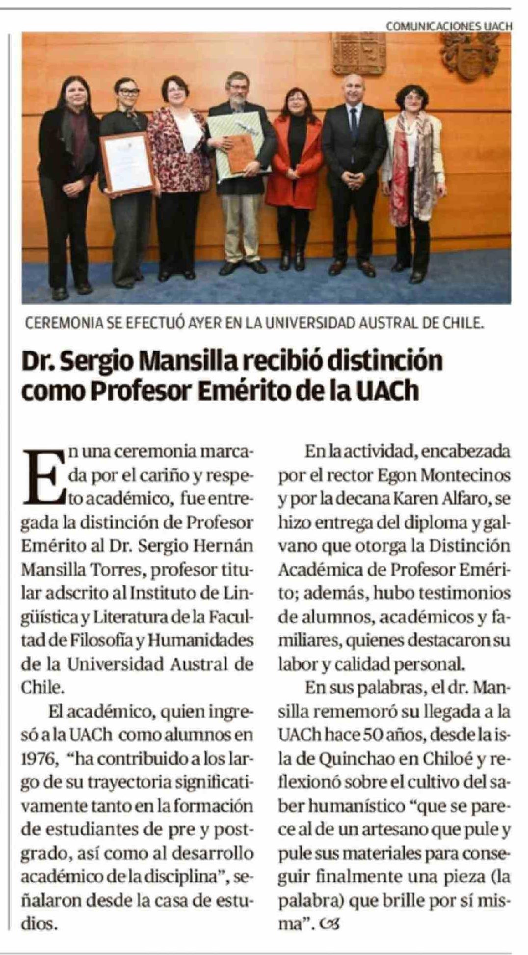 Dr. Sergio Mansilla recibió distinción como Profesor Emérito de la UACh