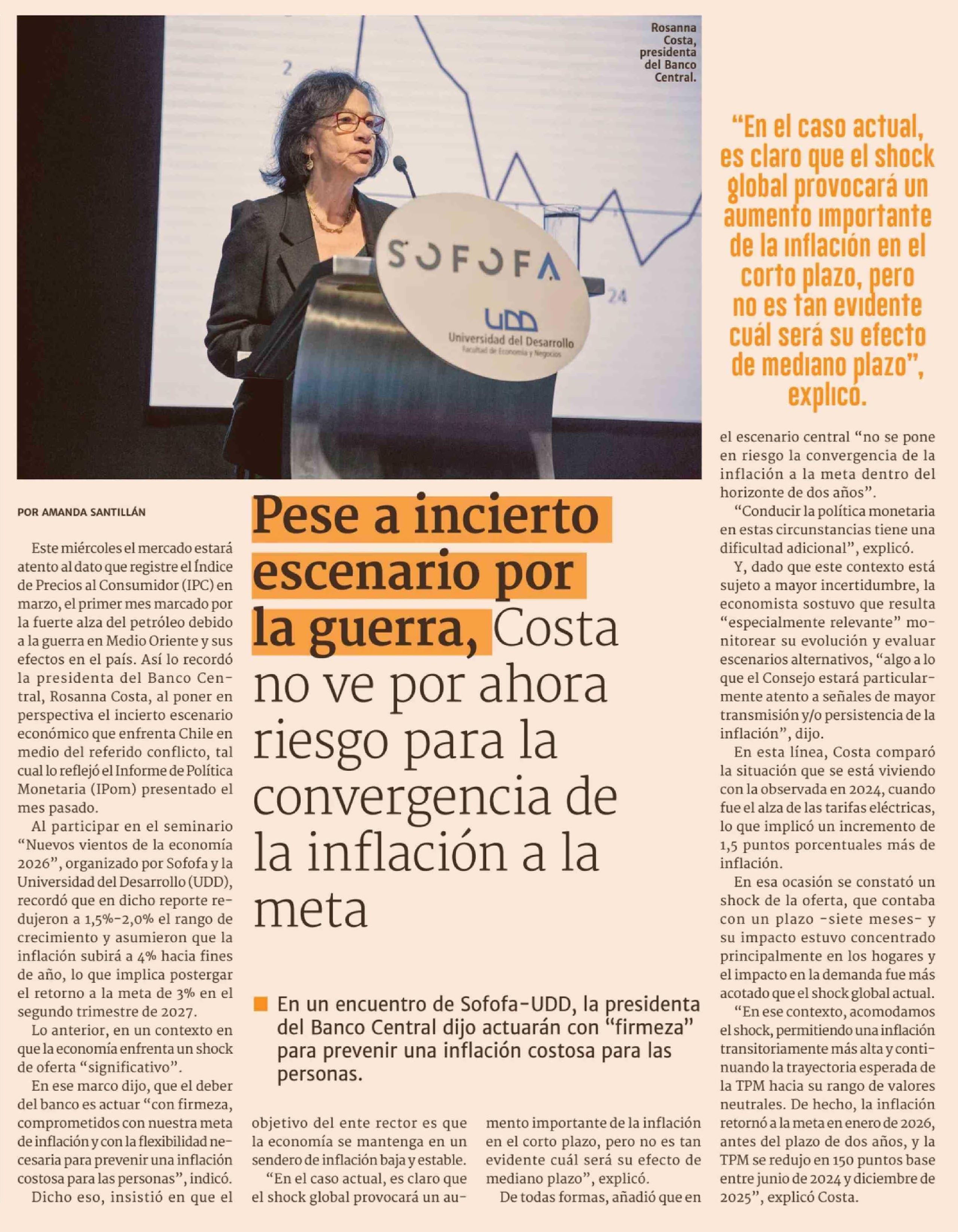 Pese a incierto escenario por la guerra, Costa no ve por ahora riesgo para la convergencia de la inflación a la meta