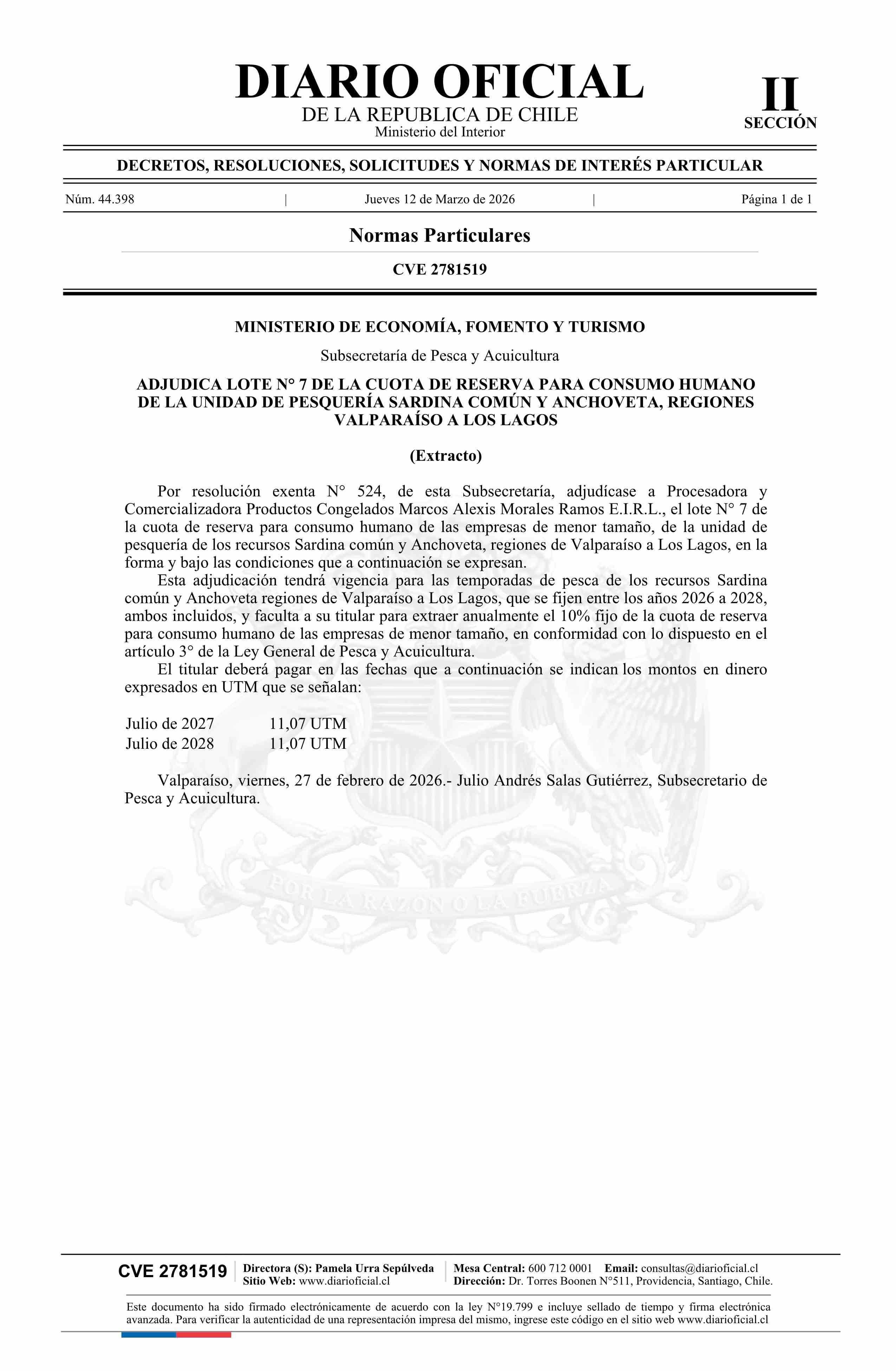 Título: Extracto de resolución exenta número 524, de 2026.- Adjudica lote N° 7 de la cuota de reserva para consumo humano de la unidad de pesquería Sardina común y Anchoveta, regiones de Valparaíso a Los Lagos