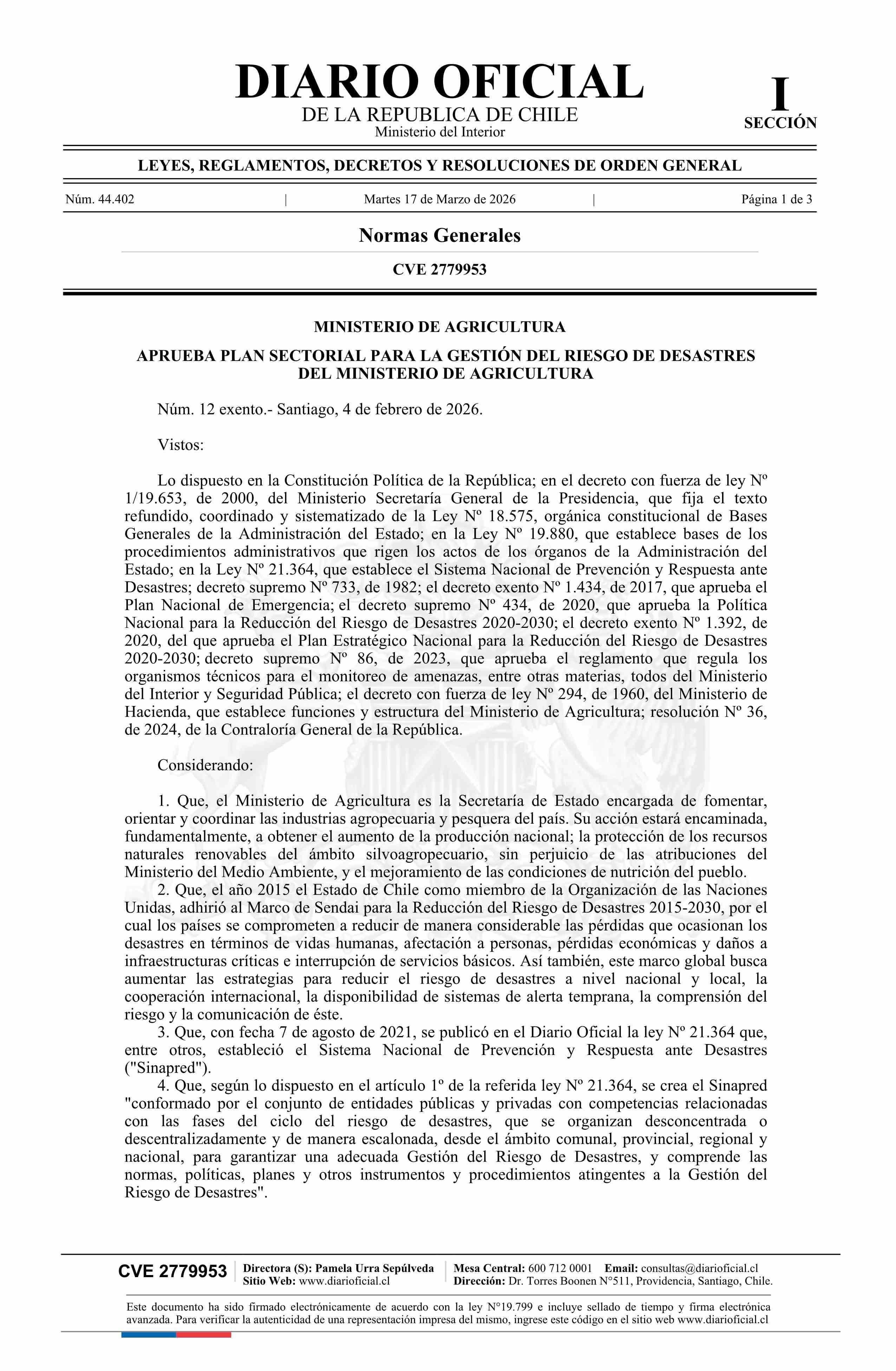 | Título: | Decreto exento número 12, de 2026.- Aprueba Plan Sectorial para la Gestión del Riesgo de Desastres |