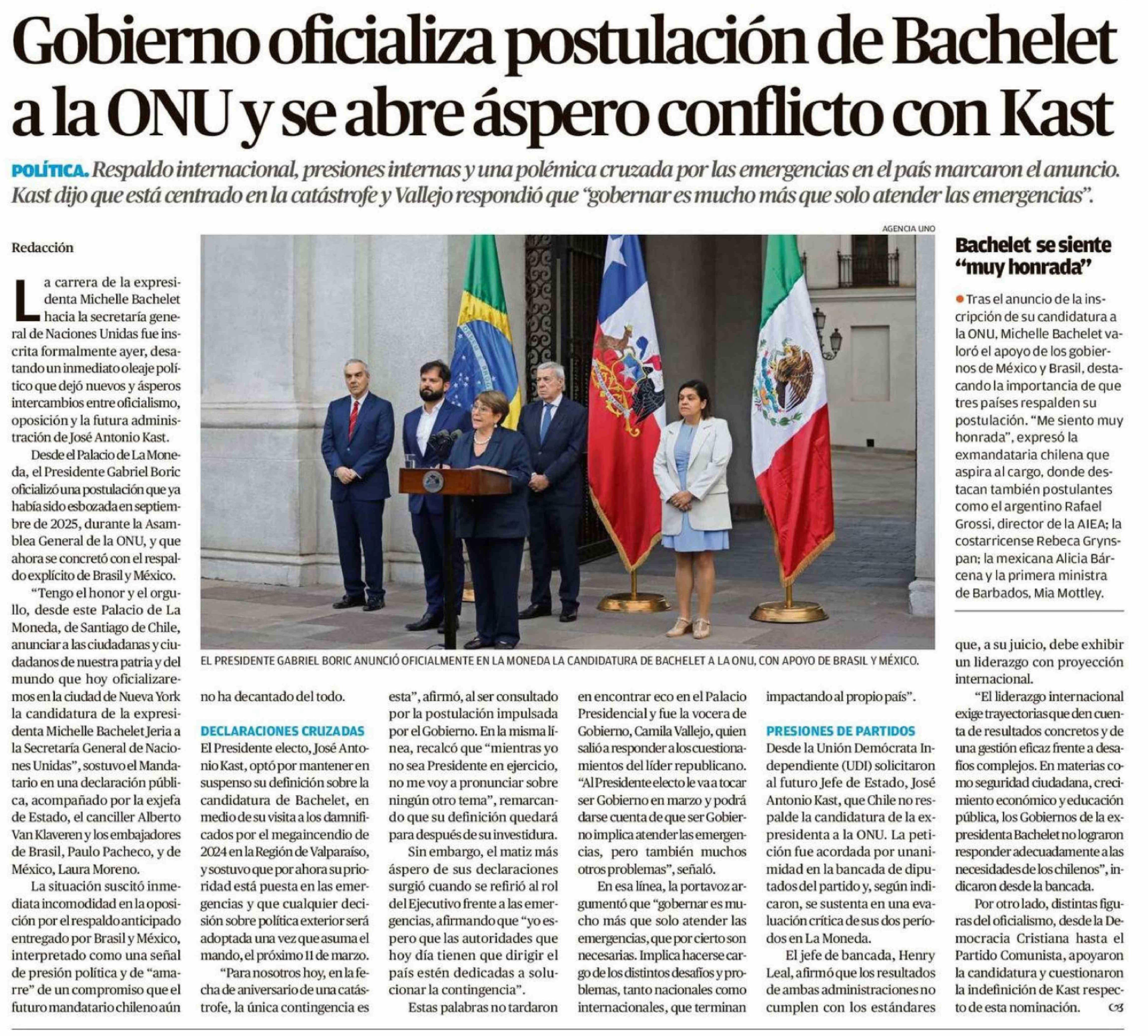 Gobierno oficializa postulación de Bachelet a la ONU y se abre áspero conflicto con Kast