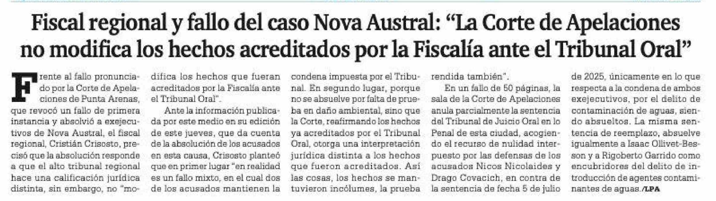 | Título: | Fiscal regional y fallo del caso Nova Austral: "La Corte de Apelaciones no modifica los hechos acreditados por la Fiscalía ante el Tribunal Oral" |