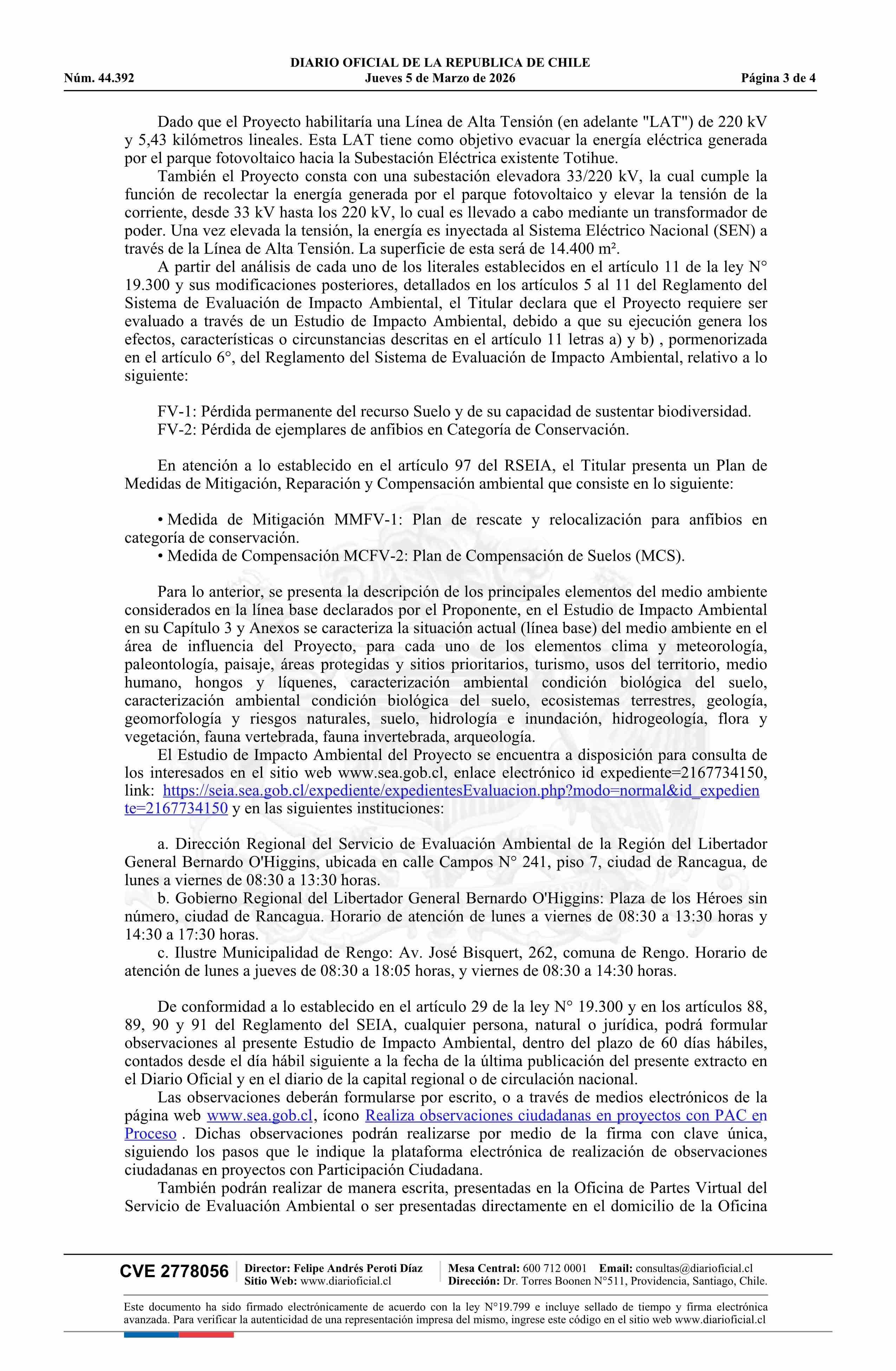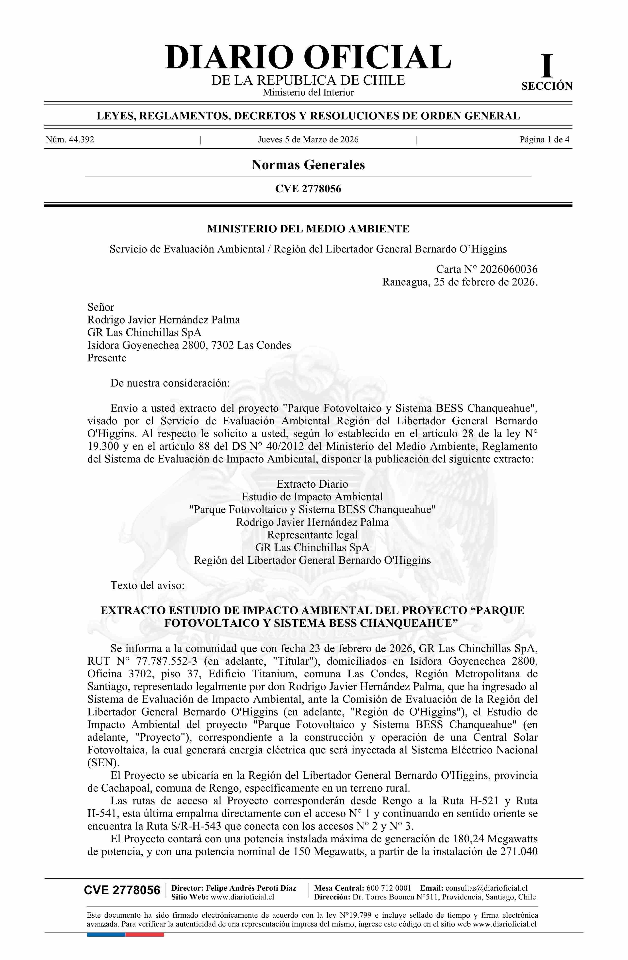| Título: | Extracto de Estudio de Impacto Ambiental del proyecto Parque Fotovoltaico y Sistema BESS Chanqueahue |
