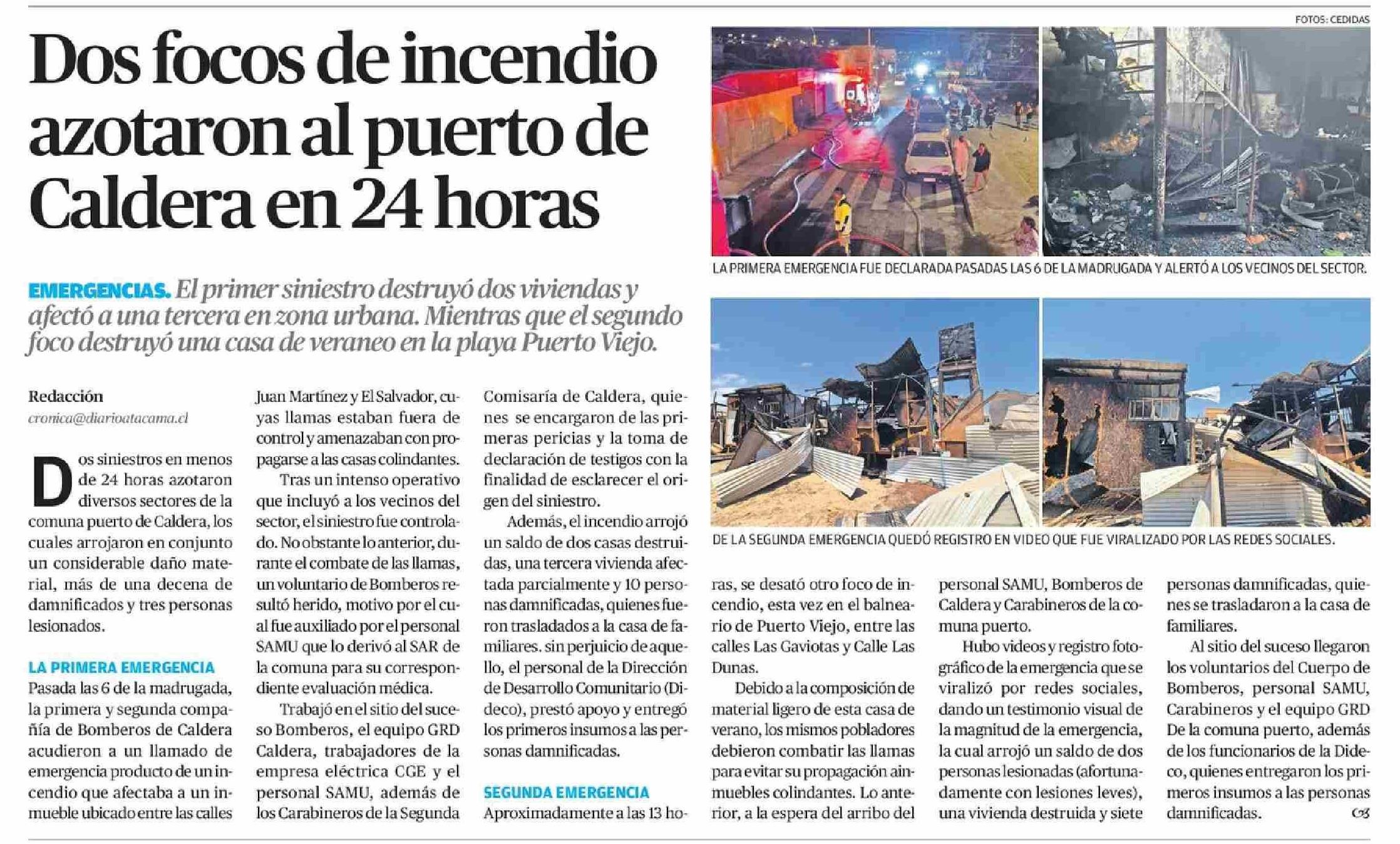 Dos focos de incendio azotaron al puerto de Caldera en 24 horas