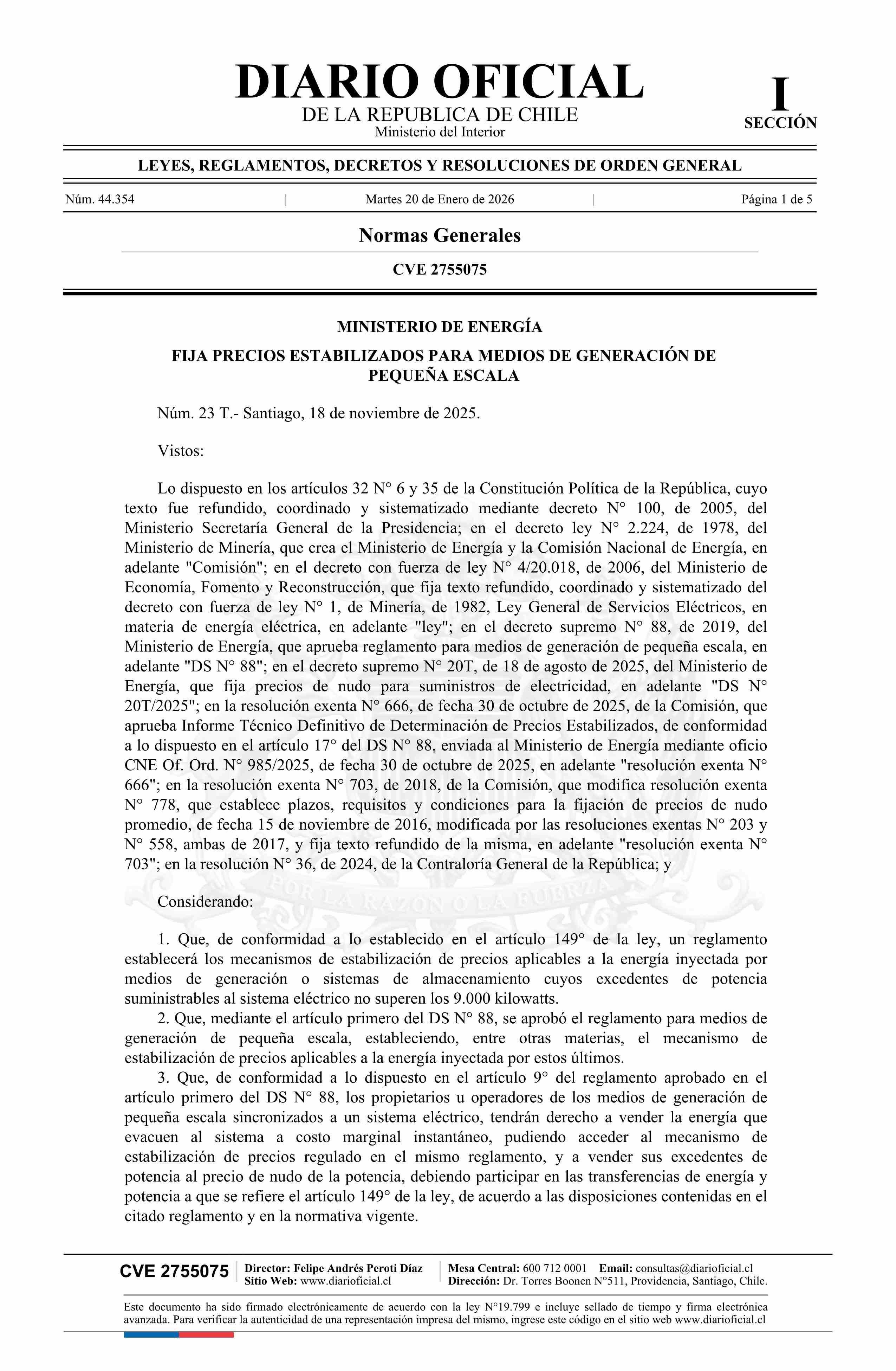 | Título: | Decreto número 23T, de 2025.- Fija precios estabilizados para medios de generación de pequeña escala |