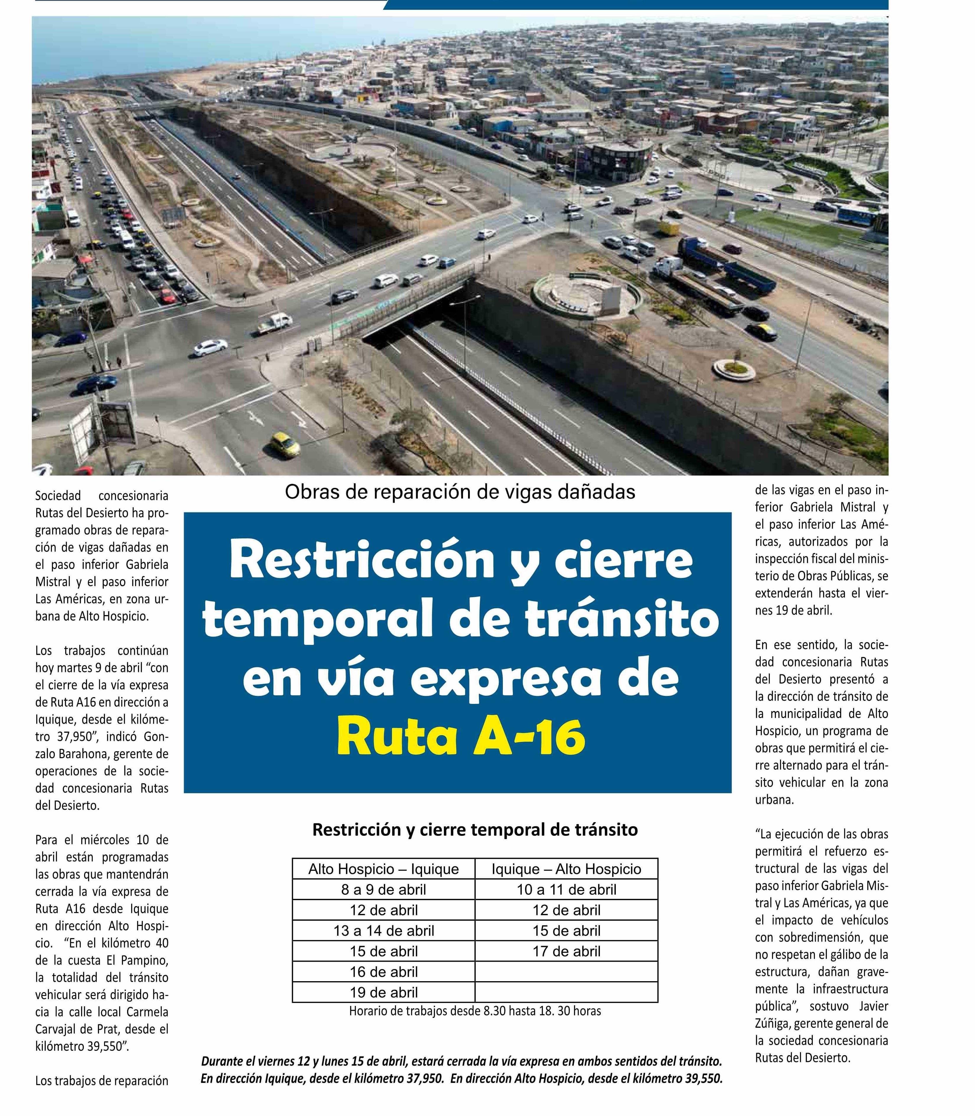Restricción y cierre temporal de tránsito en vía expresa de Ruta A-16